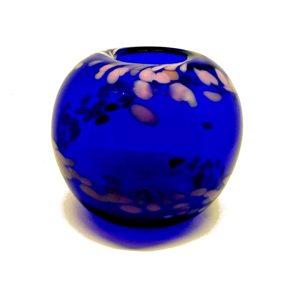 An opaque trail of opal, rose and dark pink decorates this beautiful large Bristol Blue round vase. This handmade limited edition item is approximately 18 - 20 cm tall and 15 - 17 cm wide.-