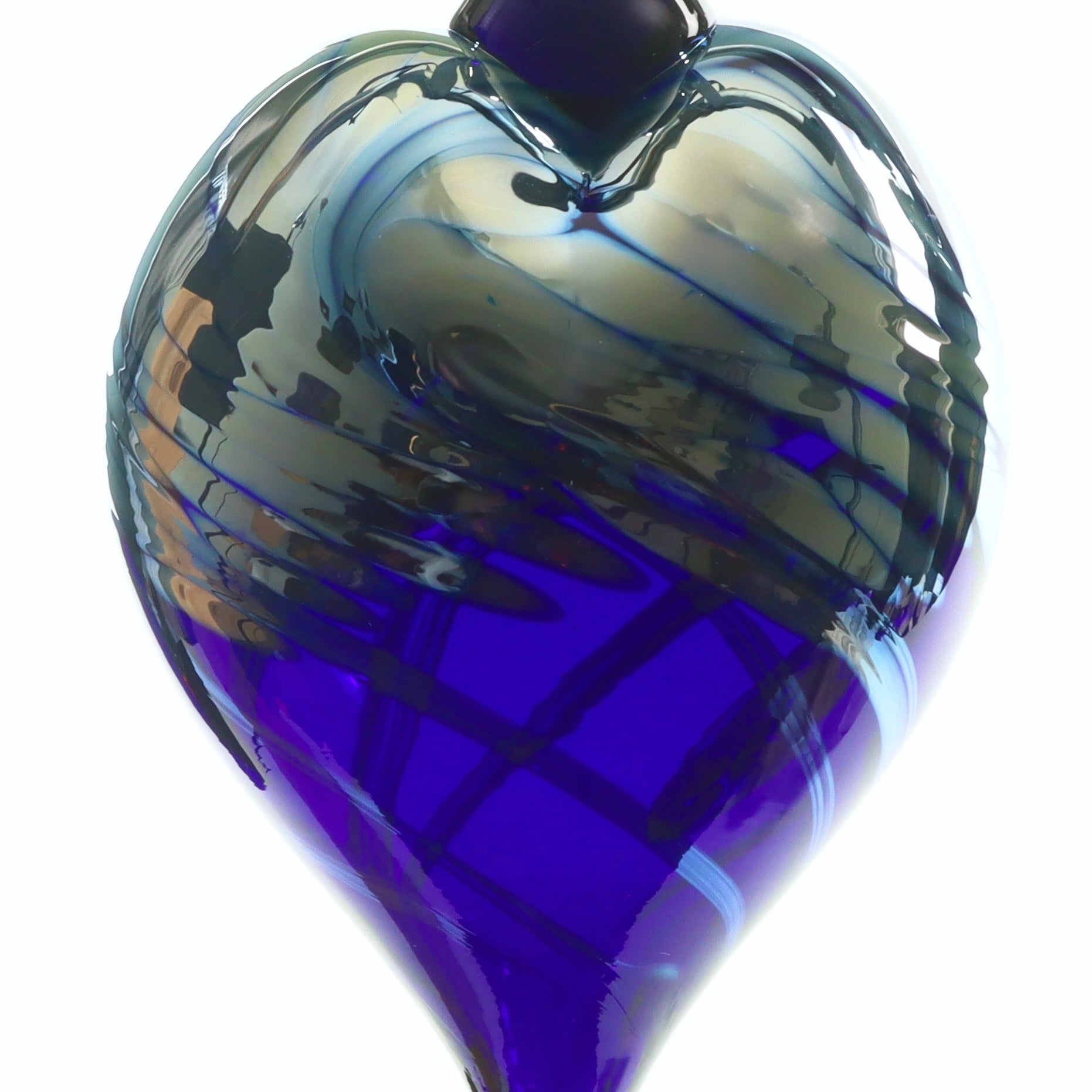A variation of the traditional blue glass 'Aurora' bauble, this version has the same distinctive reflective silver pattern but is heart-shaped.