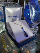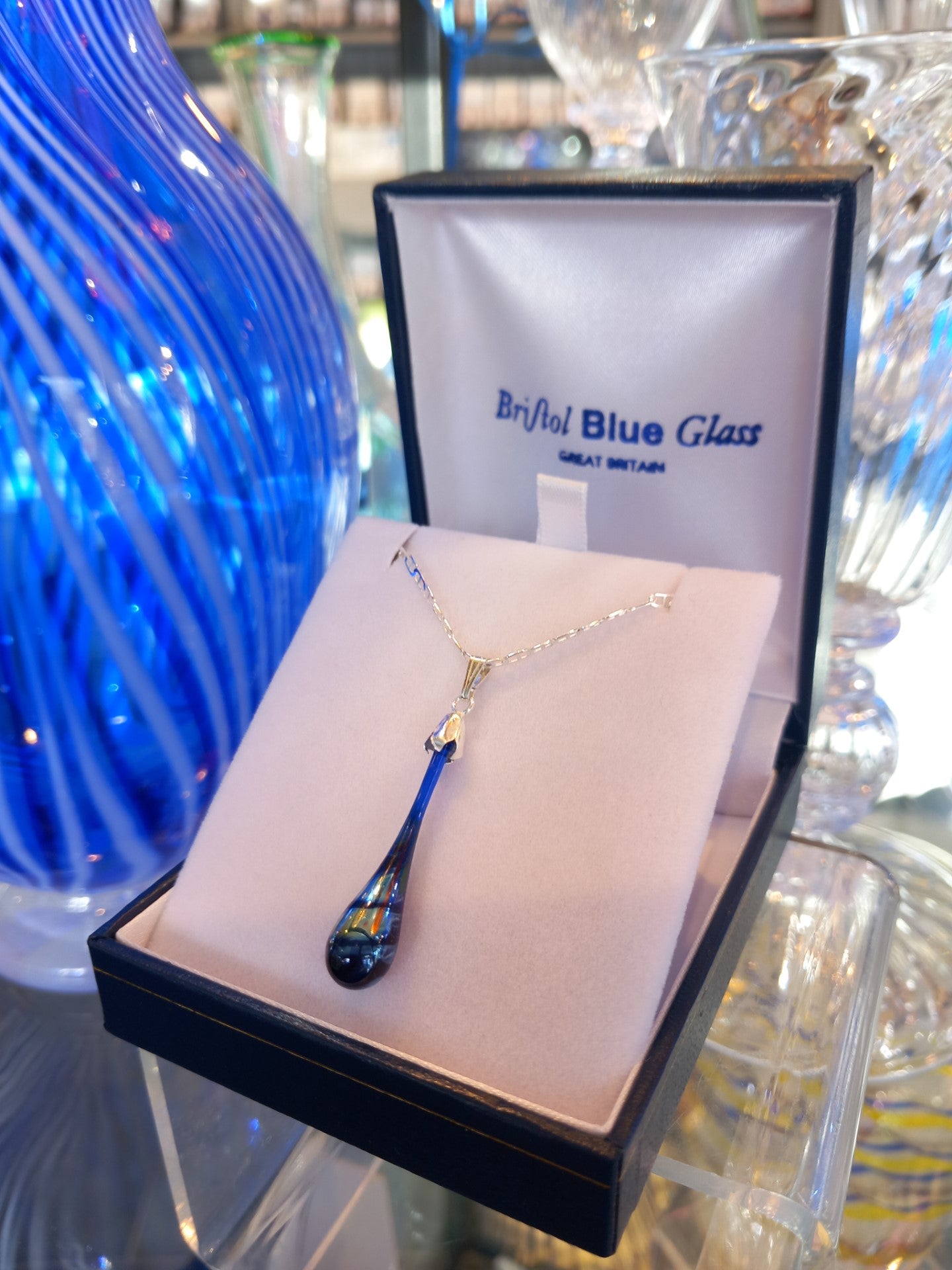 Blue glass drop pendant necklace on a sterling silver chain. A popular product and available in chain lengths 16" and 18".