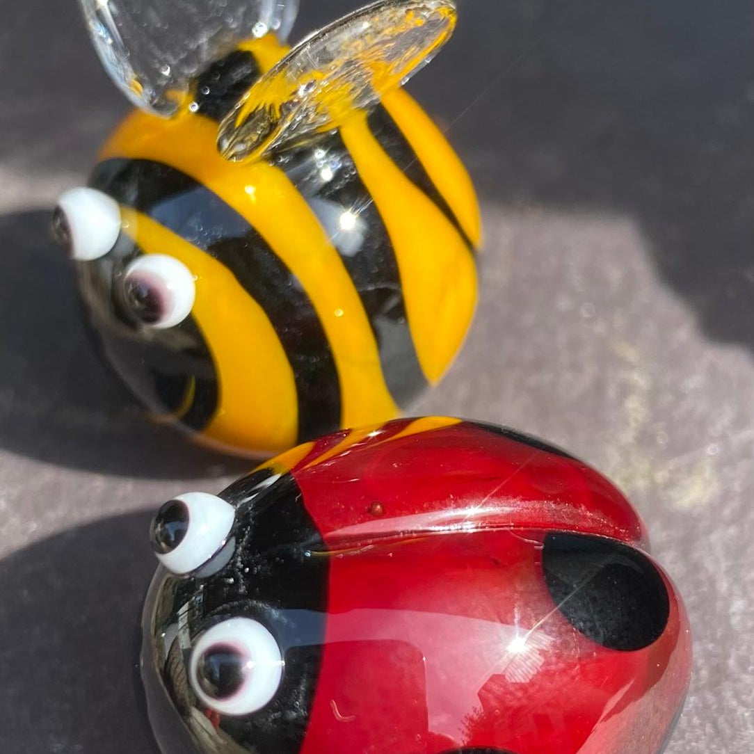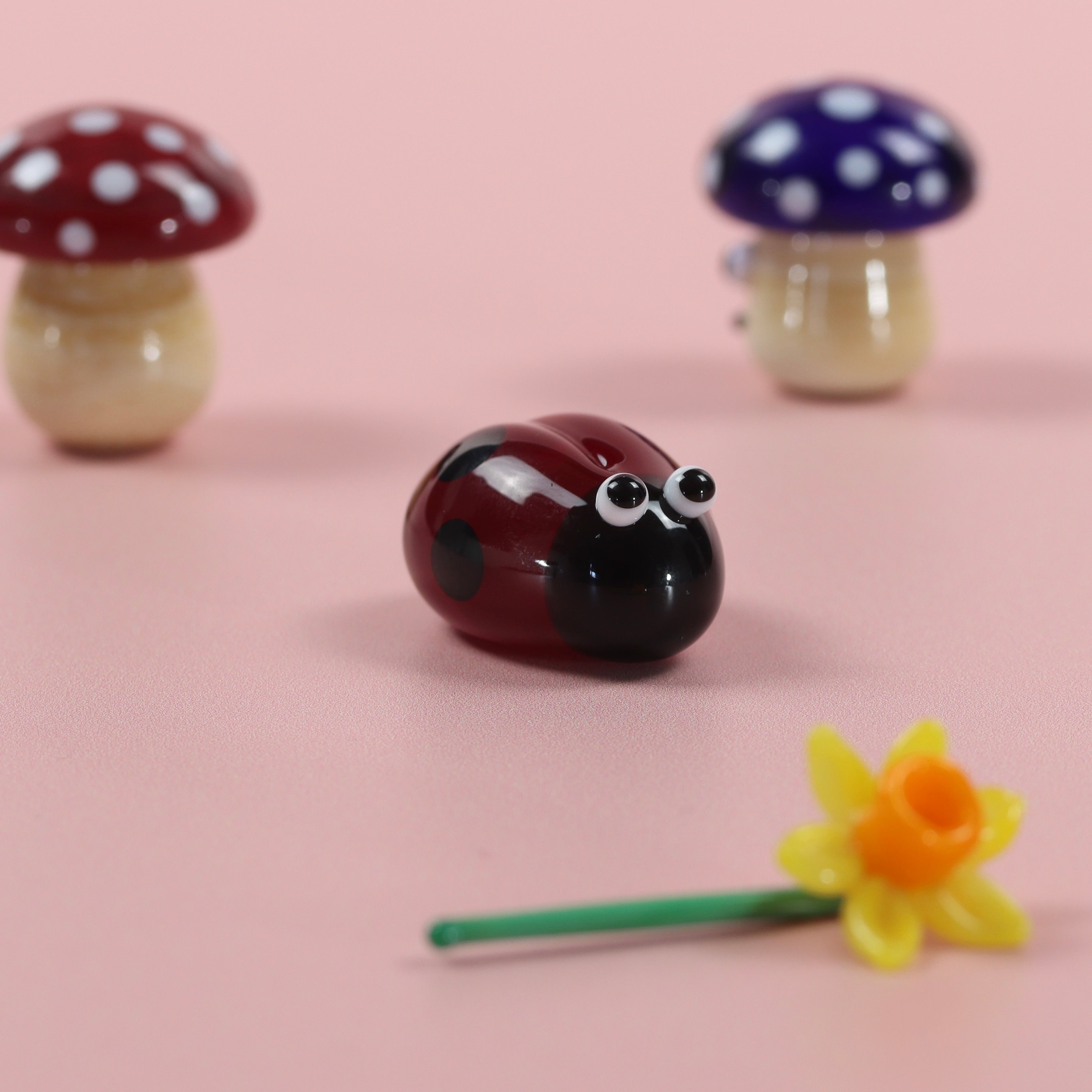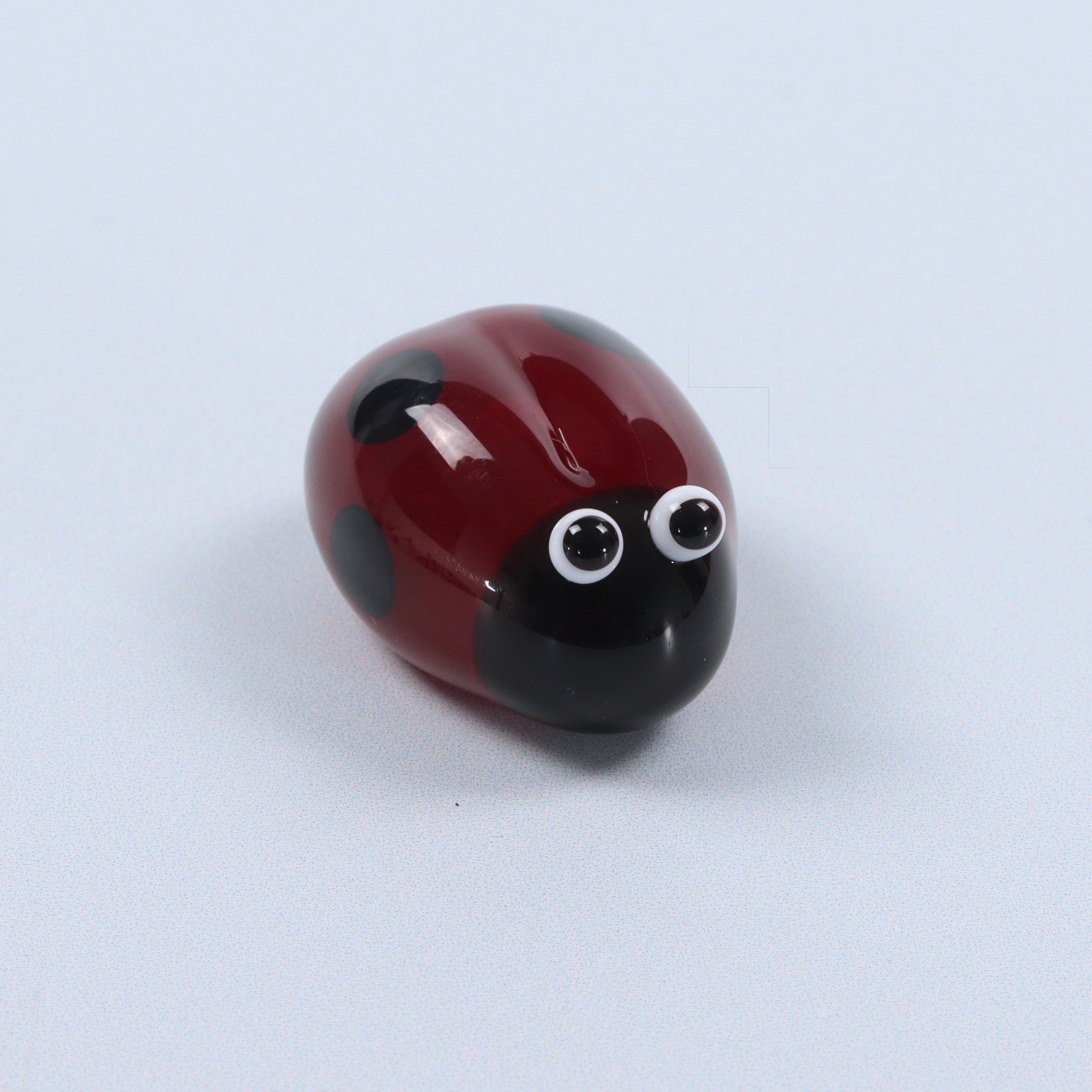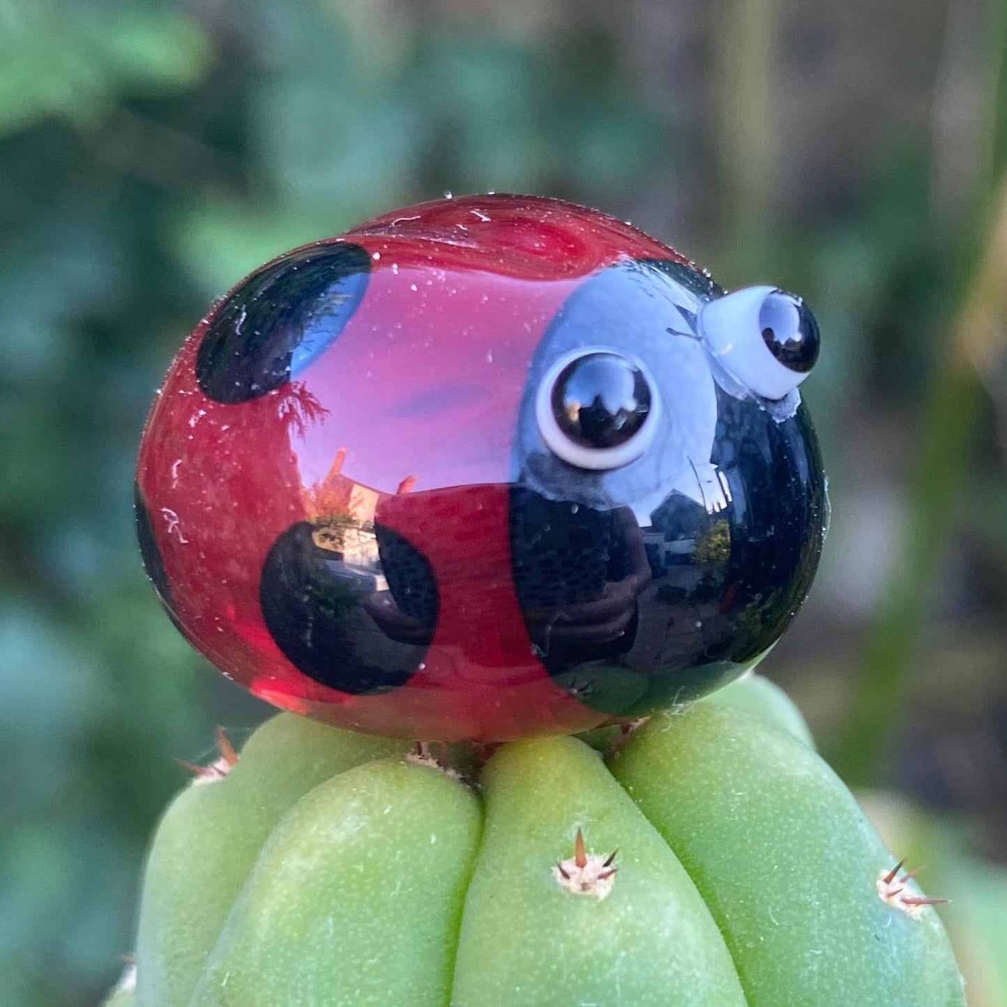 This dinky handmade ladybug gives joy to all, with her polka-dot jacket! In fields of green, where wildflowers sway, She flutters, a tiny queen of the day,  Her jacket, a shield of vibrant hue, Protecting her from the world, and me and you!   This teeny tiny wonder is lamp worked by hand and stands at 2cm high (ish).