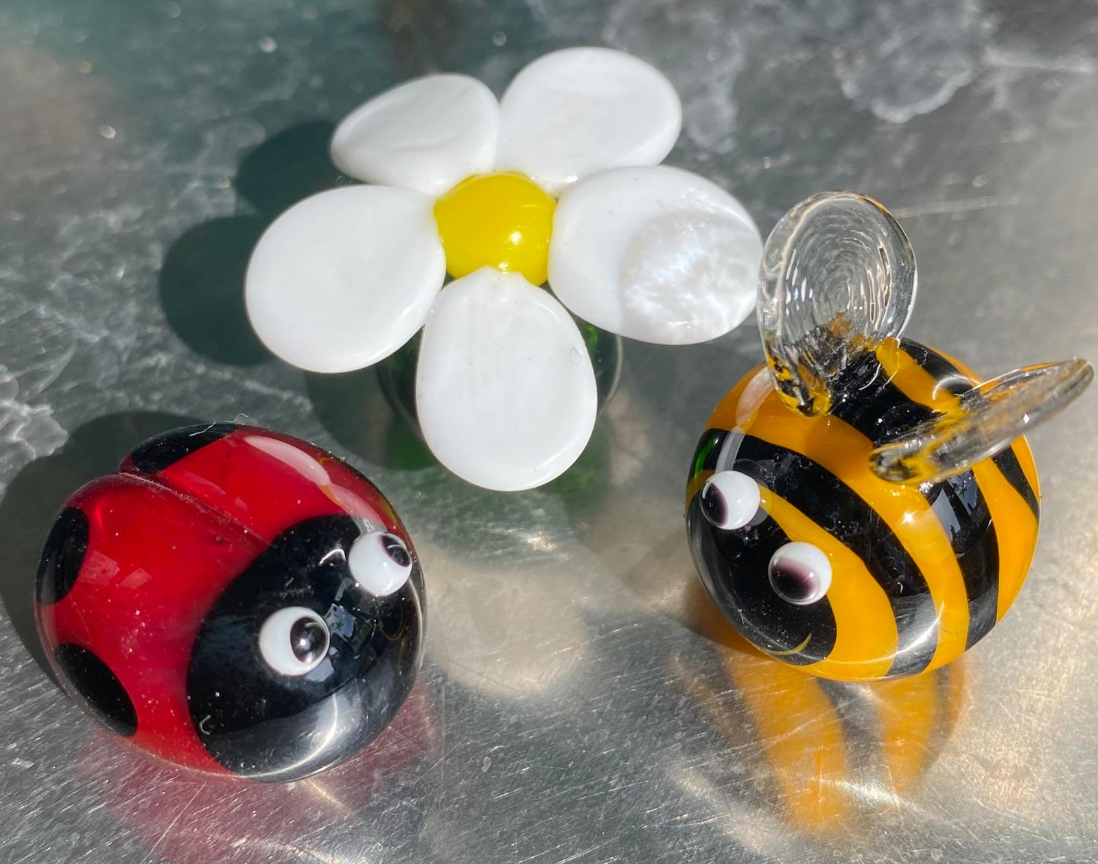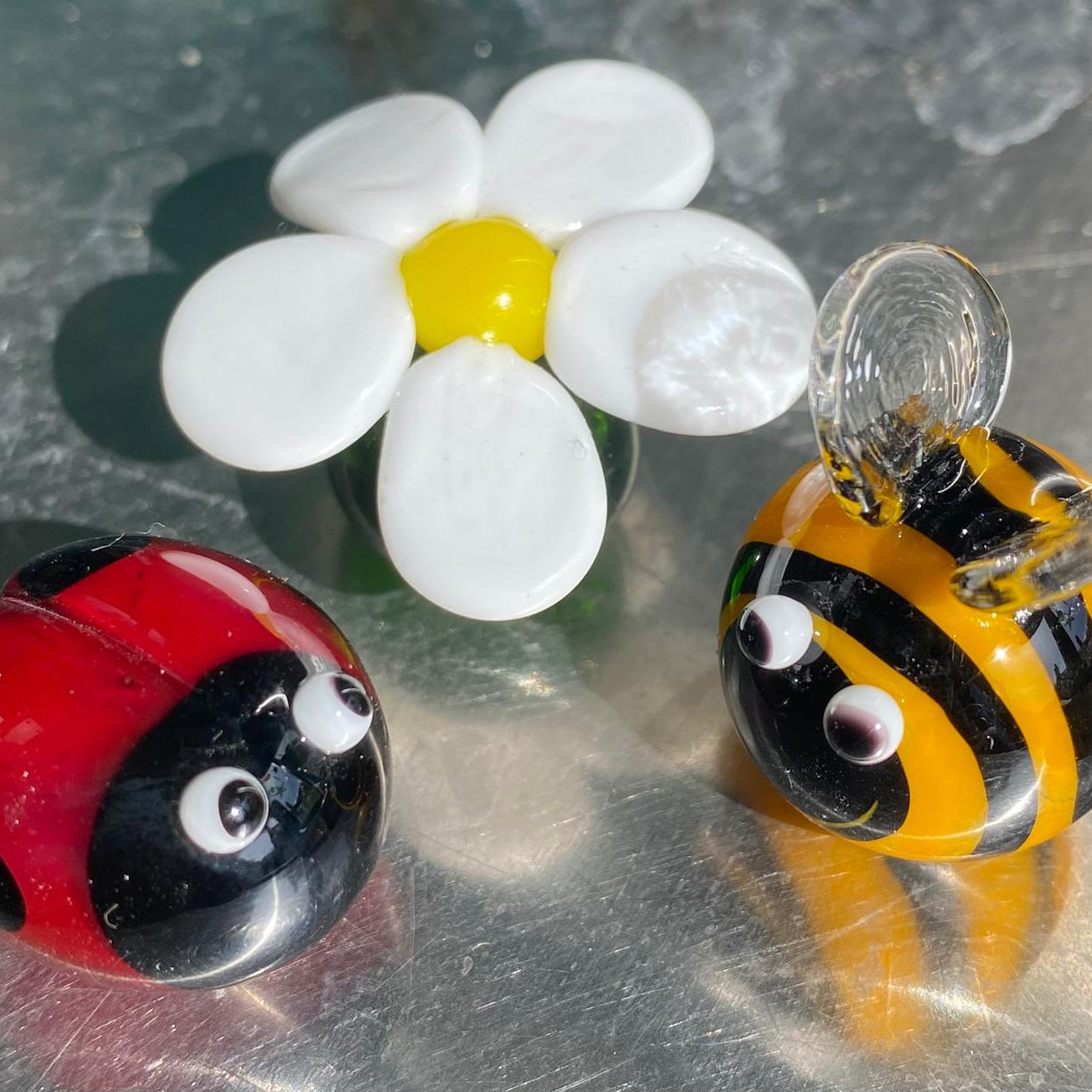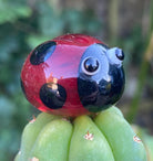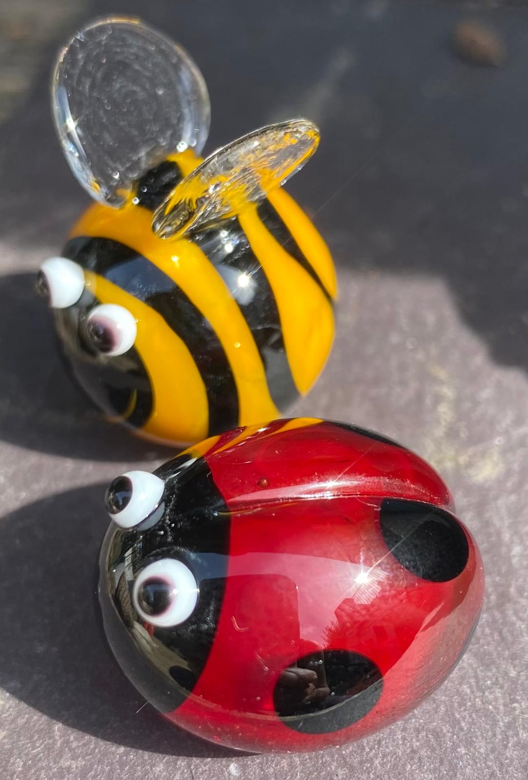 This dinky handmade ladybug gives joy to all, with her polka-dot jacket! In fields of green, where wildflowers sway, She flutters, a tiny queen of the day,  Her jacket, a shield of vibrant hue, Protecting her from the world, and me and you!   This teeny tiny wonder is lamp worked by hand and stands at 2cm high (ish).