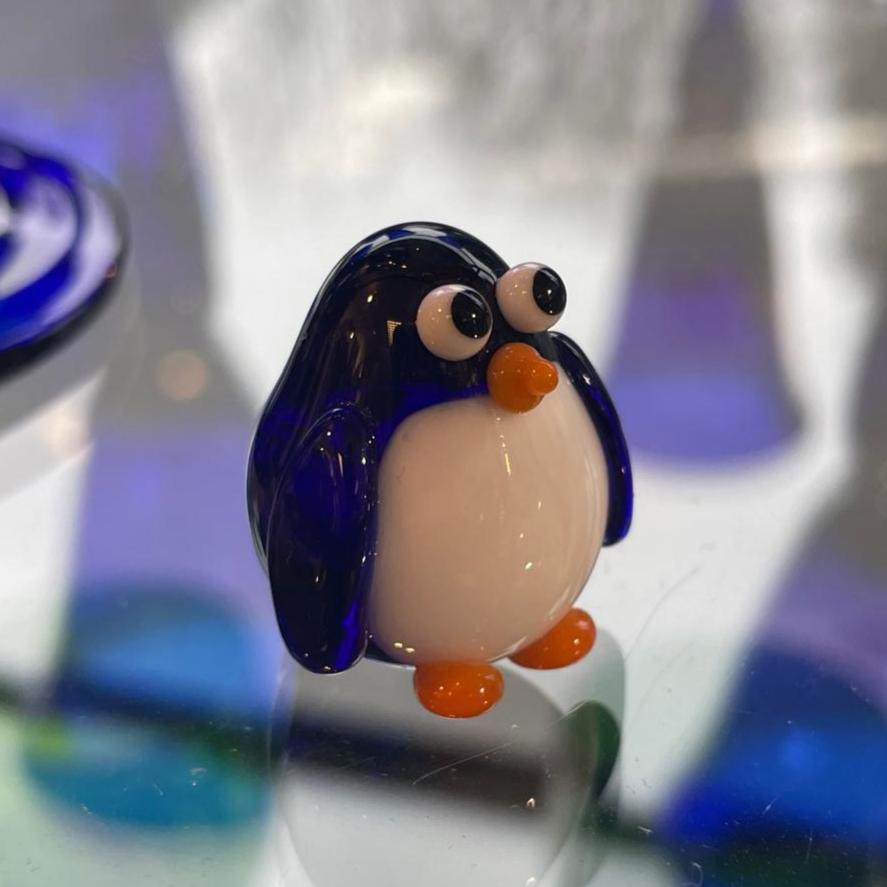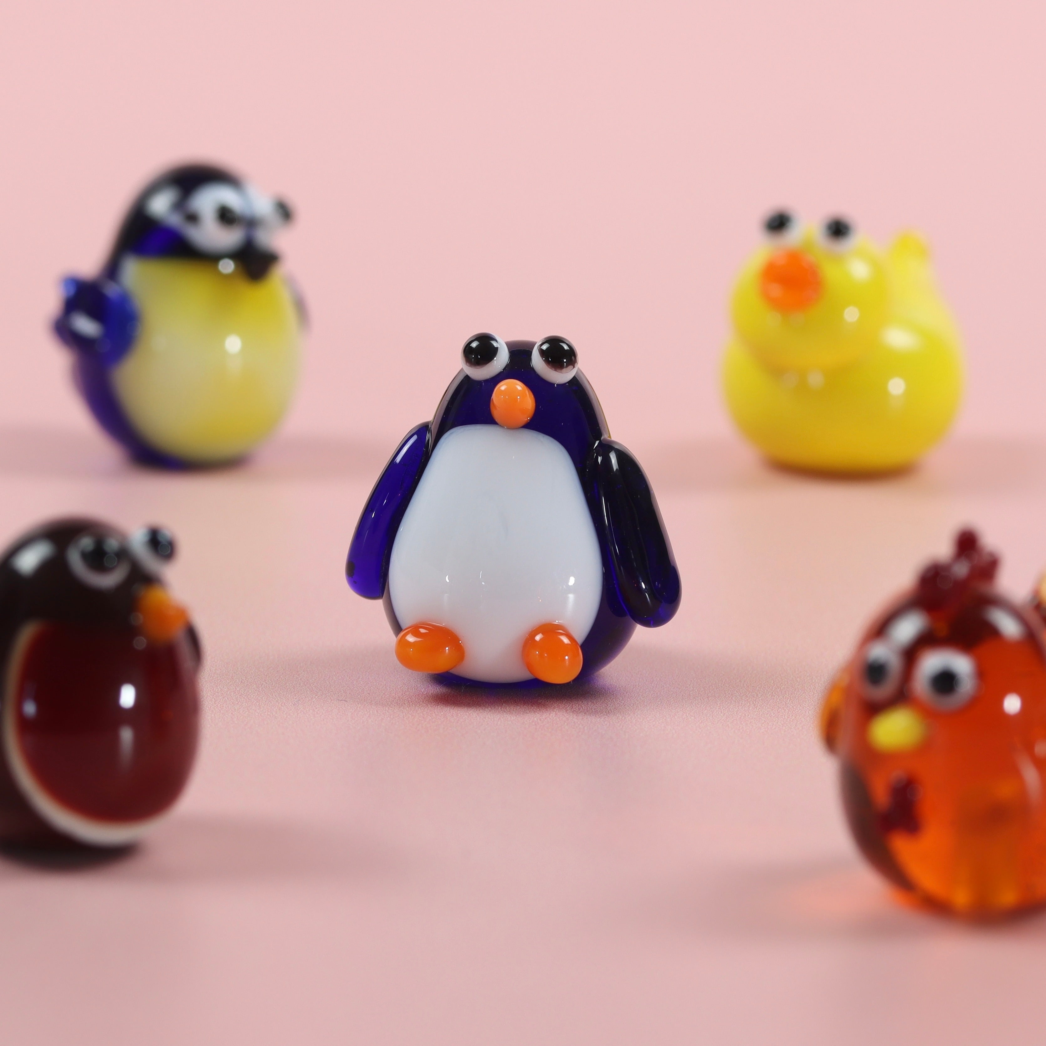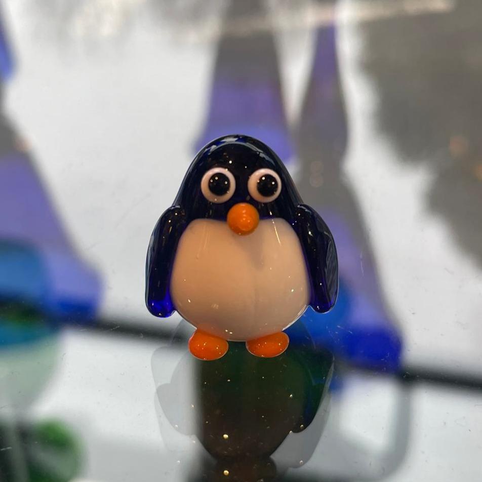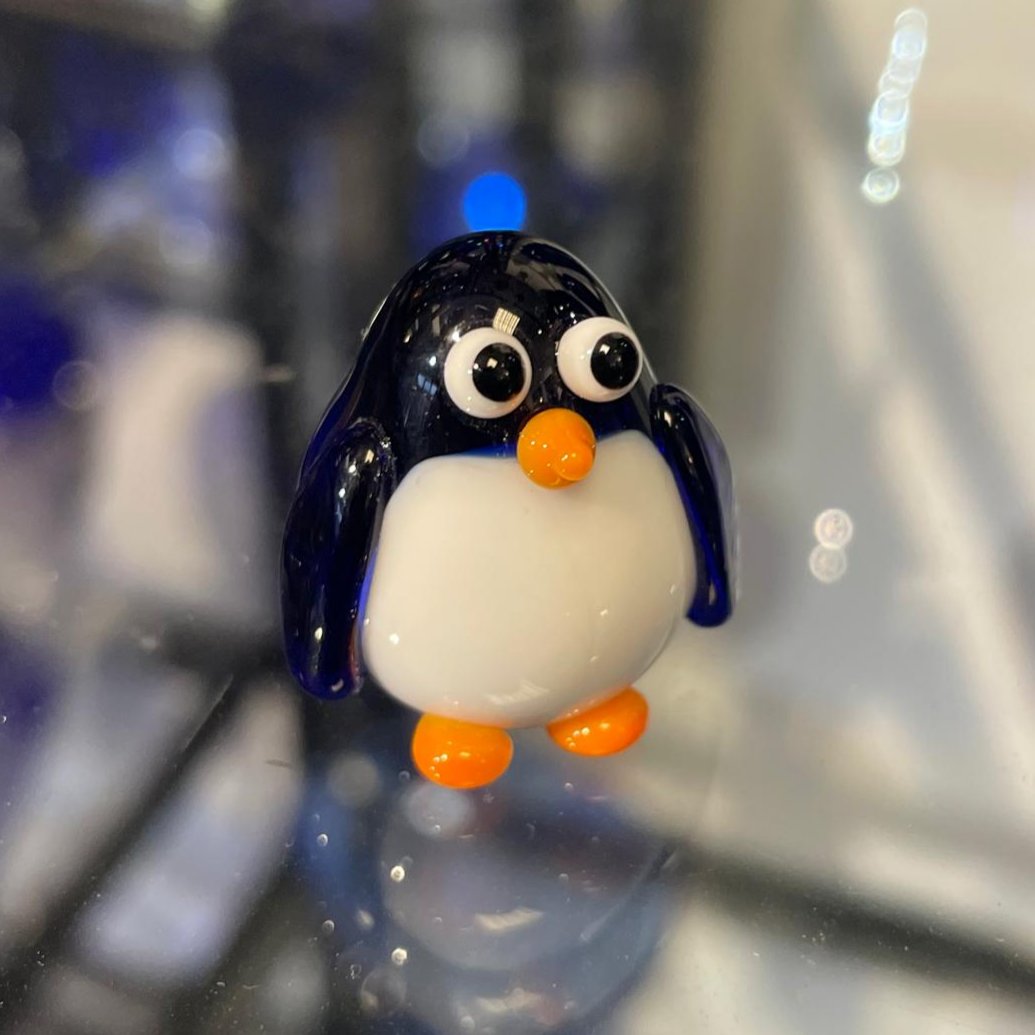 This dinky handmade penguin gives joy to all, with his crazy ooglie eyes! He'll give Feathers McGraw a run for his money! There once was a dinky penguin so small, He couldn't waddle or swim straight at all, But with heart full of glee, He danced by the sea, And brought joy to everyone big and tall! This teeny tiny wonder is lamp worked by hand and stands at 2cm high (ish).