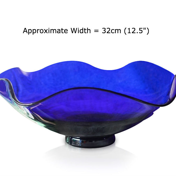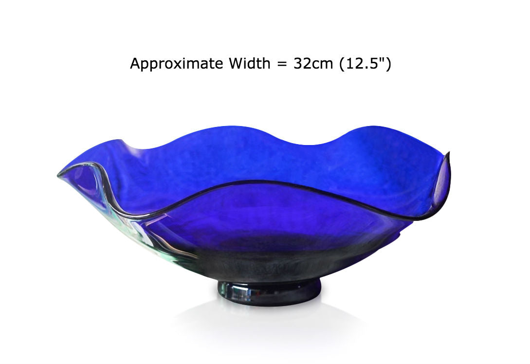 This is a gorgeous blue glass fluted dish made from Bristol blue glass and shaped by hand to produce a wavy edge around its rim. Perfect for display in almost any room of the house and it is sure to add a touch of decadence to your space. The approximate width of the dish is 32cm (or 12.5 inches).