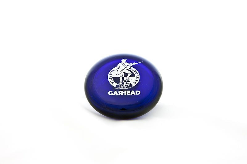 The Bristol Rovers "Gashead" paperweight. A flat, engraved paperweight for the perpetually disappointed football fan in your life. Fingers crossed for next season! Measures approximately 9cm in diameter and is a beautiful souvenir of Bristol. This Bristol blue glass paperweight is a gift that anyone would treasure.