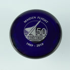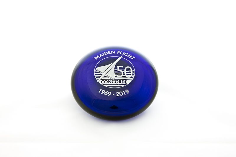 A flat engraved commemorative paperweight, depicting the iconic maiden flight of Concorde. This Bristol blue glass paperweight measuring approximately 9cm across.
