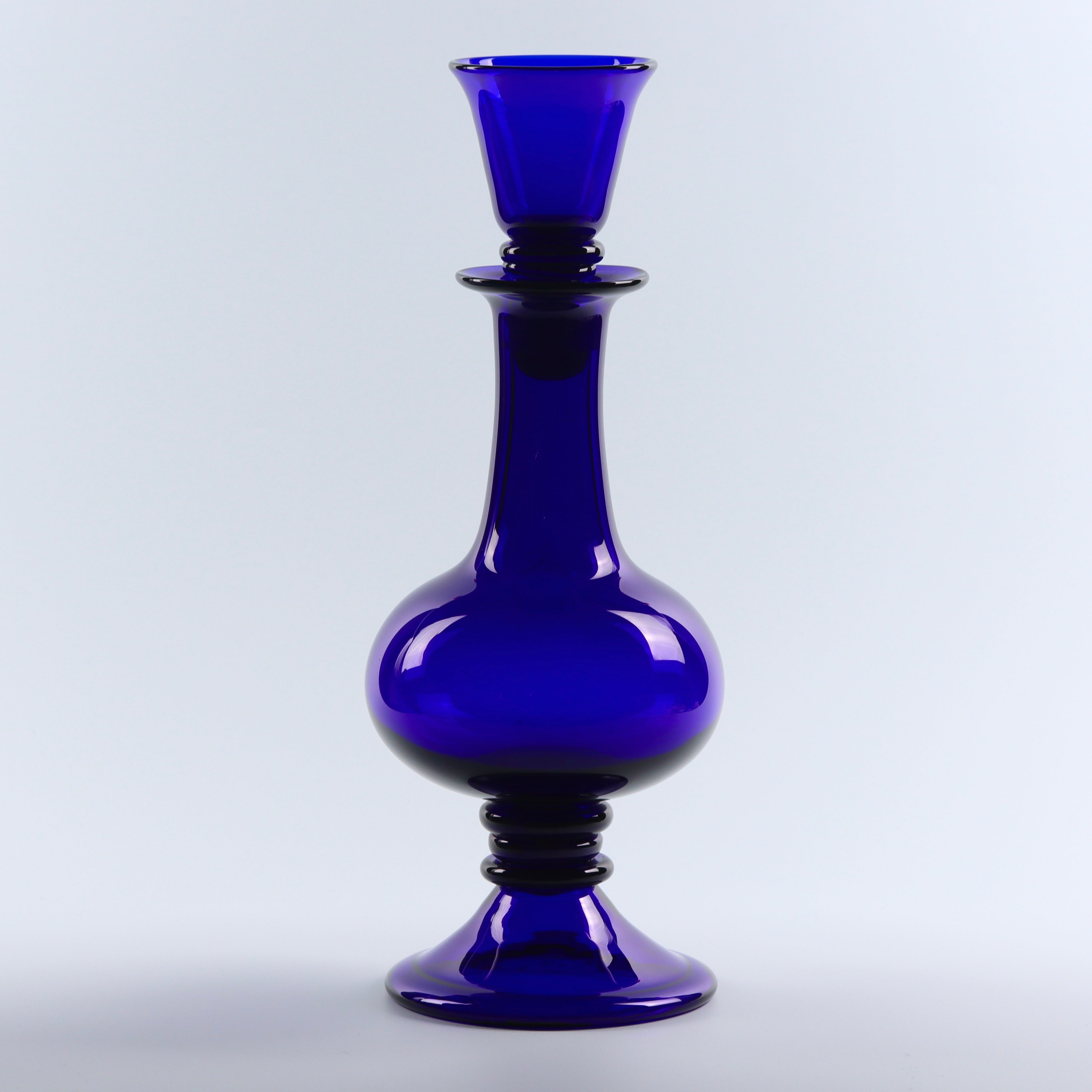 This beautiful Bristol blue glass blown-footed decanter is made in the "Facon De Venise" style.