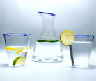An elegant Crystal Clear Water Carafe and beaker pair set. Designed to grace any table, this set is individually hand made in crystal clear glass and decorated with a blue trail around the rim of each piece. Completely handmade in Bristol with the finest glass, no moulds or machines are used in any part of the process.