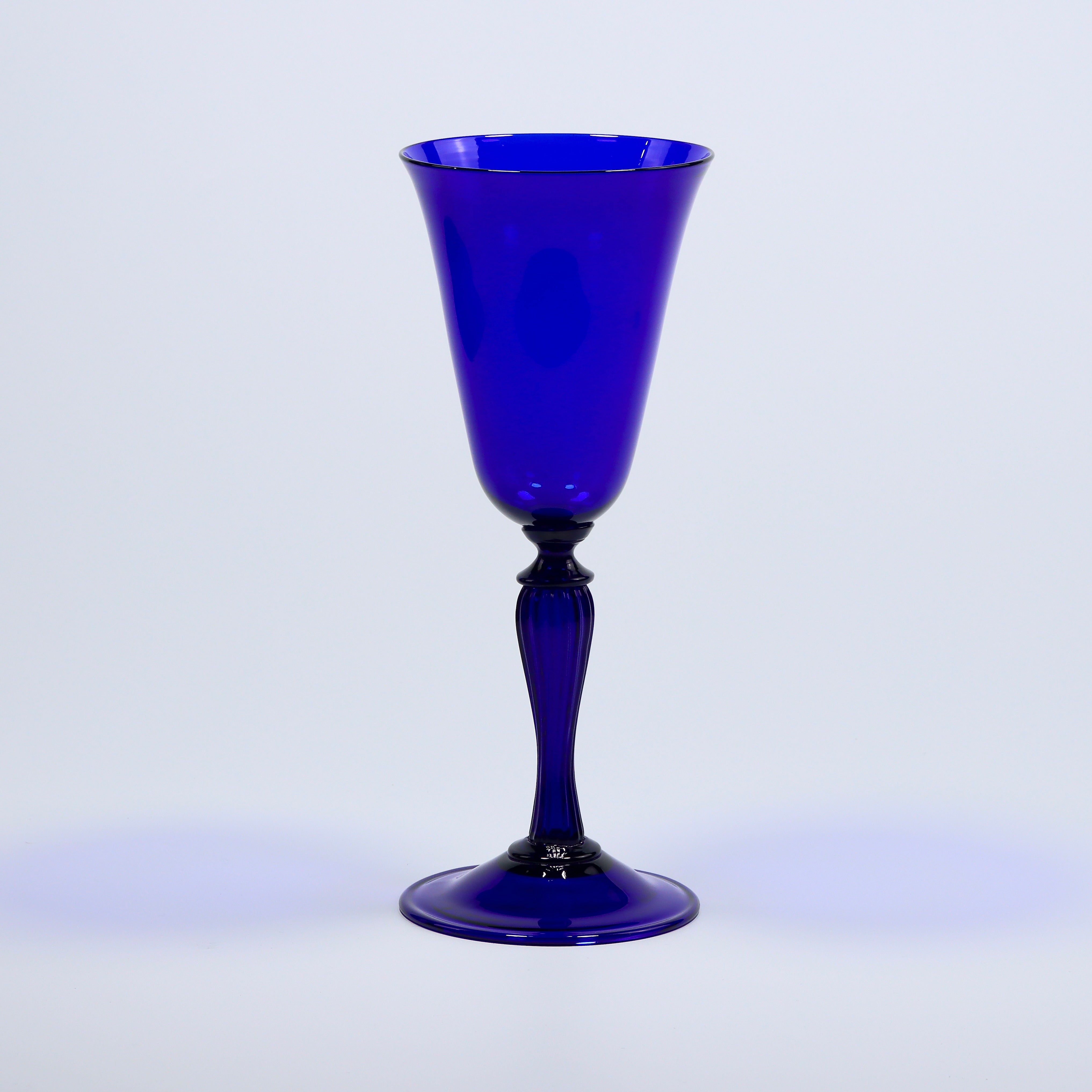 A delightful and delicately-blown Bristol blue glass optical stem goblet, characterised by ornate and ribbed glasswork on the supporting stem. This goblet deserves pride of place in your glassware collection and we are proud to bring you this expertly-crafted piece. Handmade in Bristol using age-old traditional glassmaking techniques.