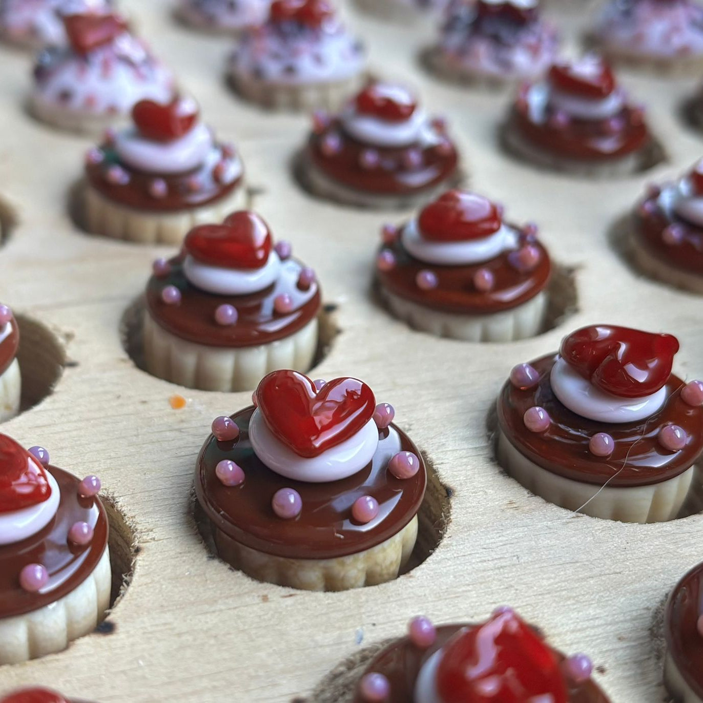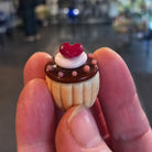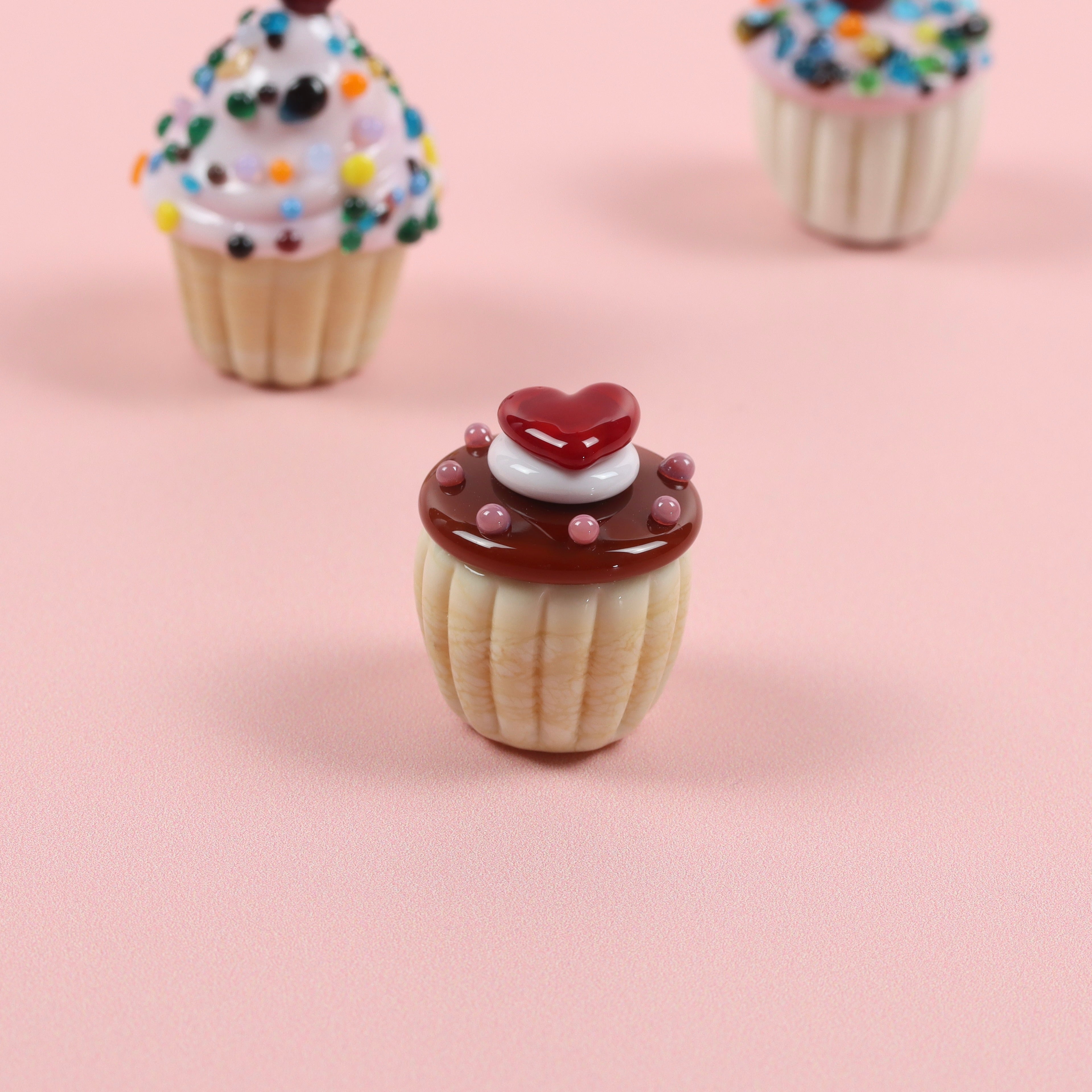 The Ultimate Chocolate Heart Topper Dinky Cupcake What says 'I love you!' like chocolate and hearts! This scrumptious teeny tiny wonder is lamp worked by hand and stands at 2cm high and 2cms wide (ish) and arrives boxed.