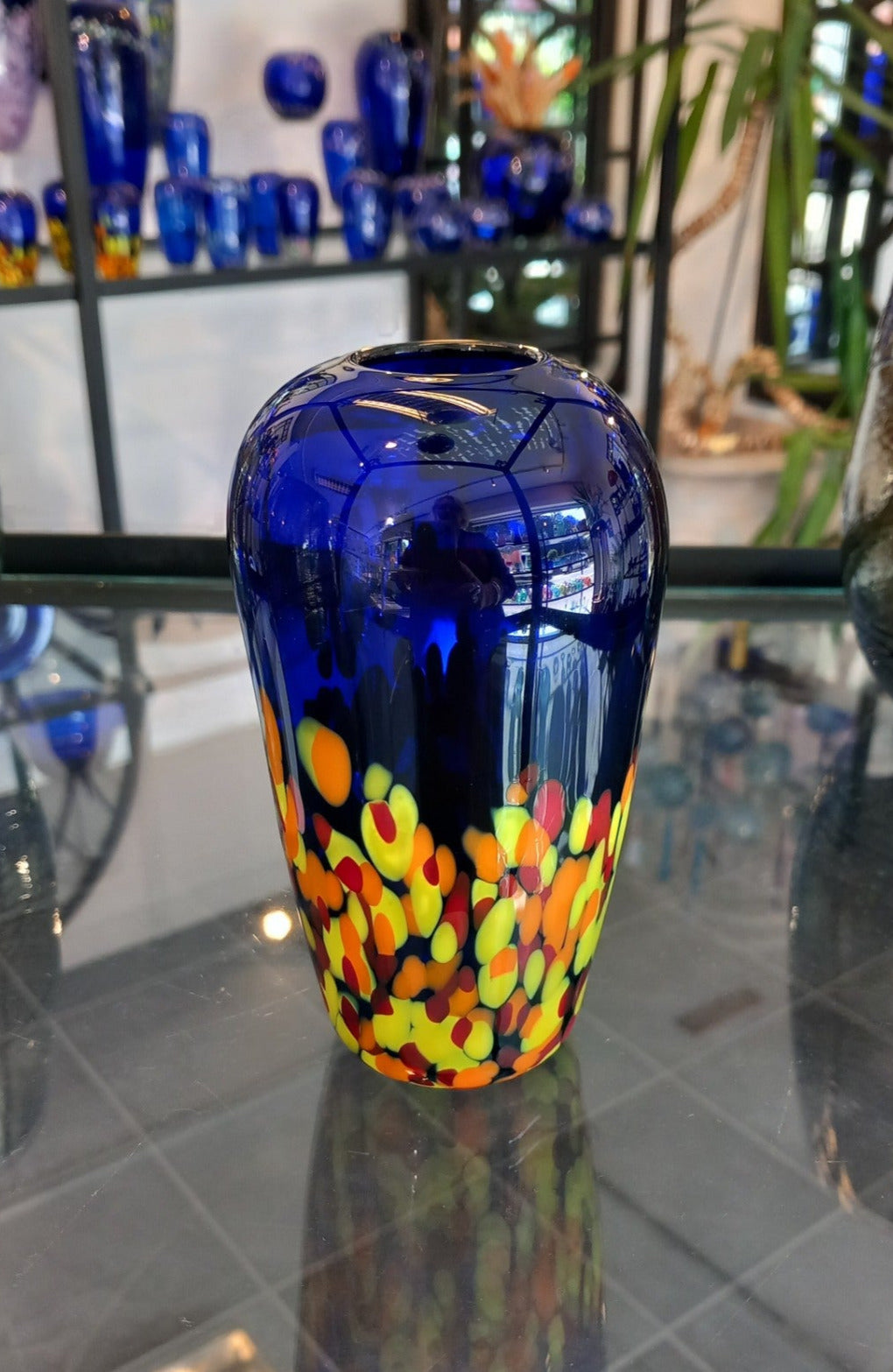 Like a blazing fire, a vivid trail of fiery colour streaks across this elegant one-piece elliptical vase, adding a bold and powerful touch.