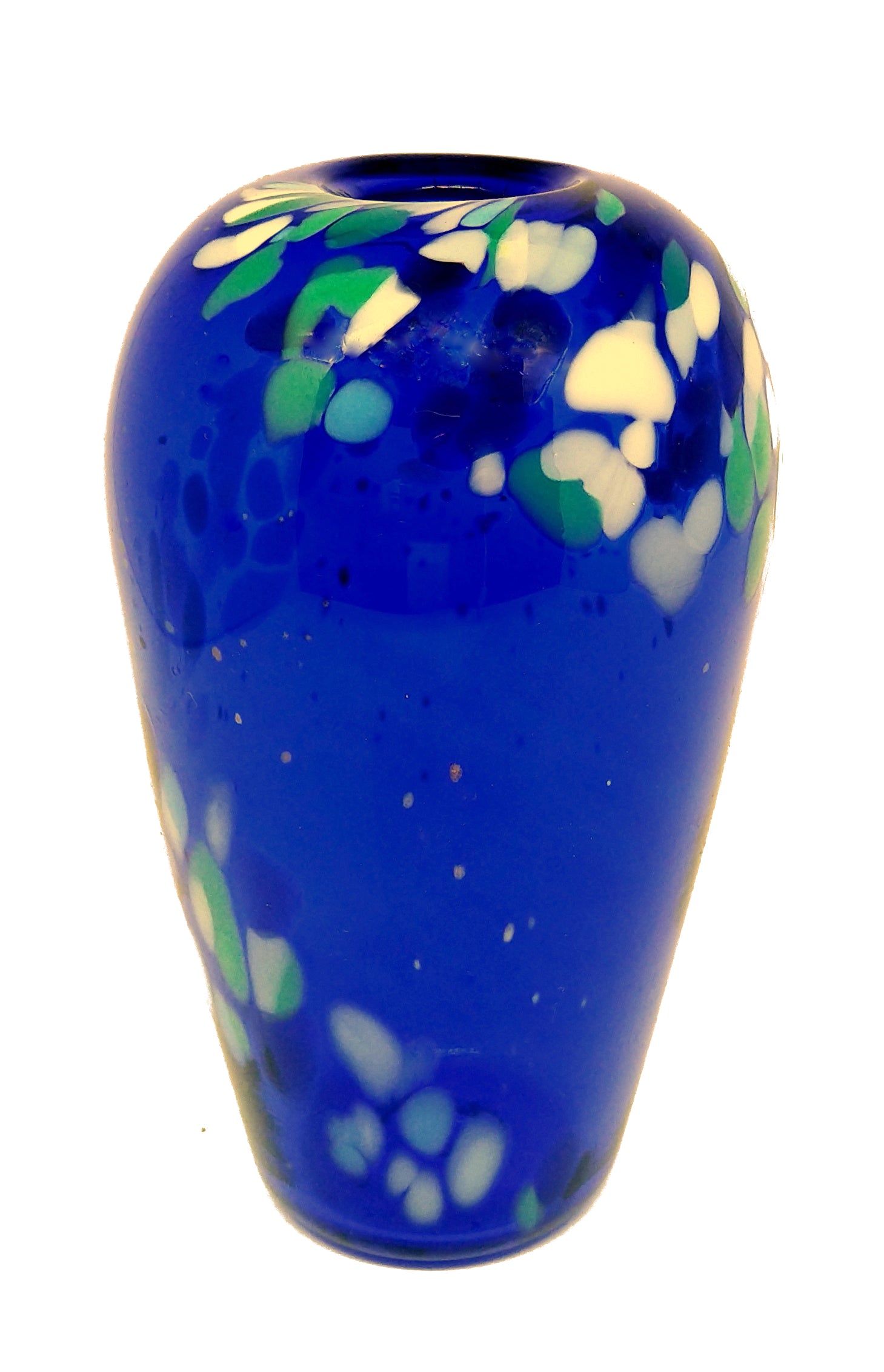 An opaque opal, cyan and green trail delicately decorates this elegant one piece elliptical vase. This uniquely hand made, limited edition item is approximately 14 cm tall