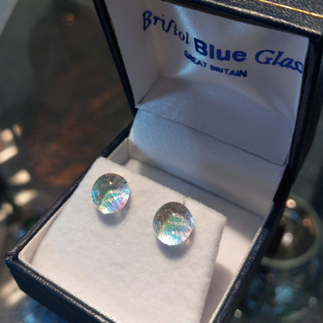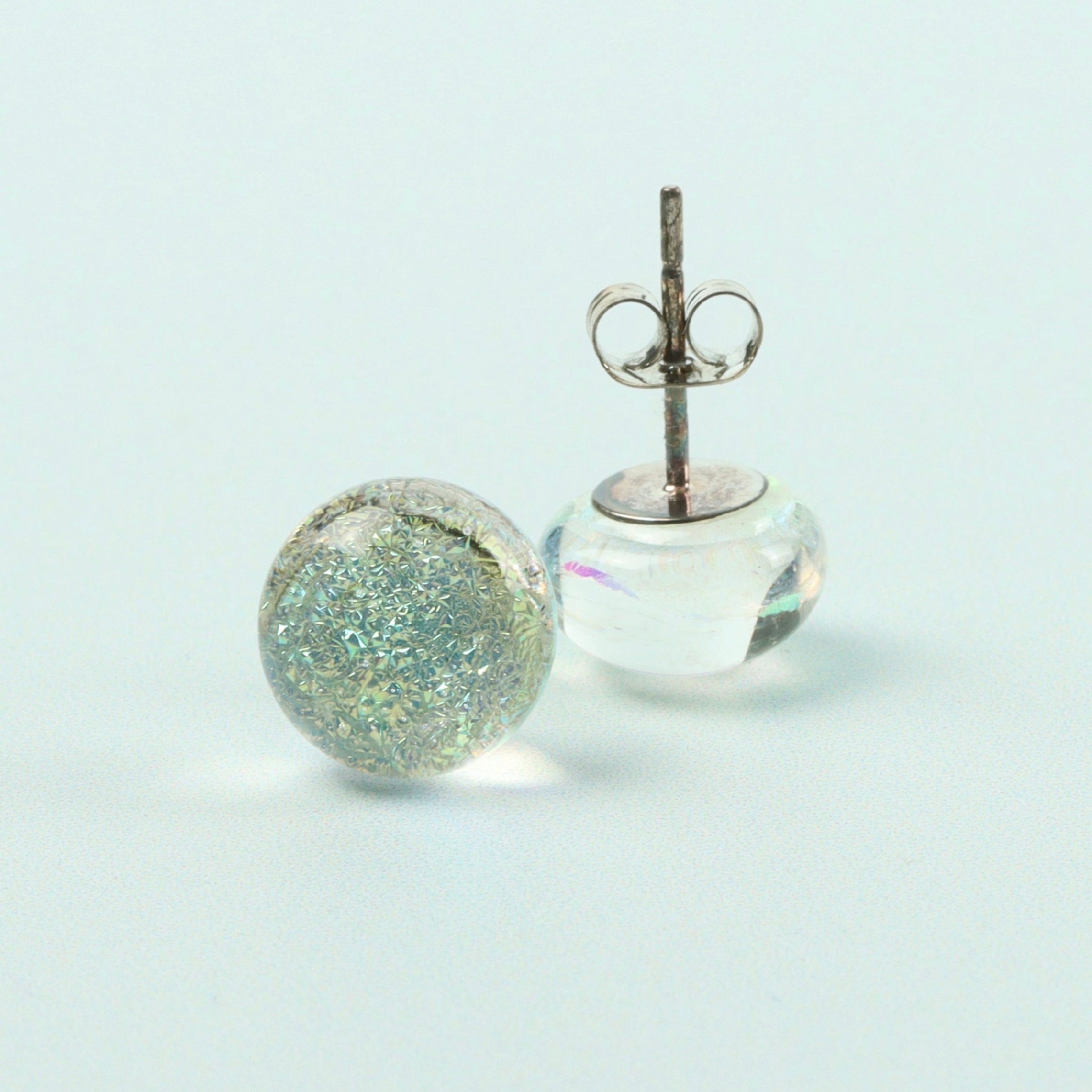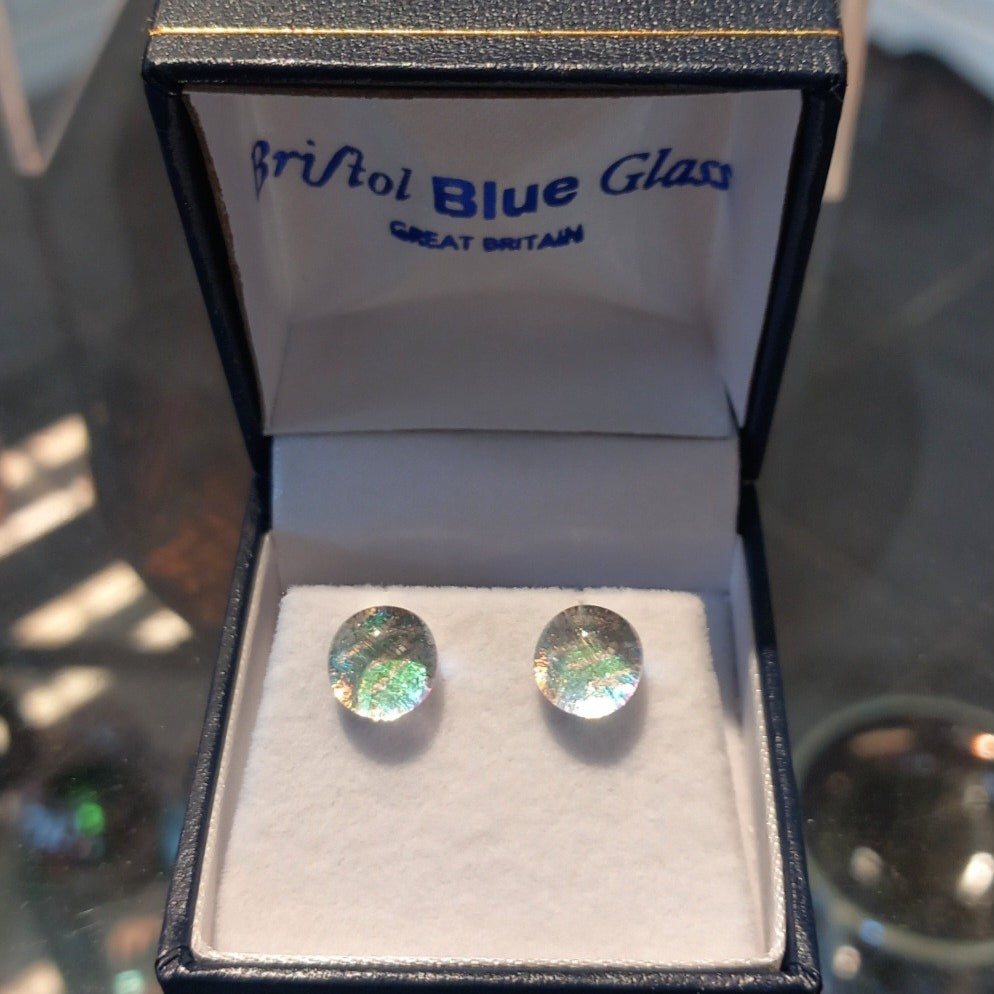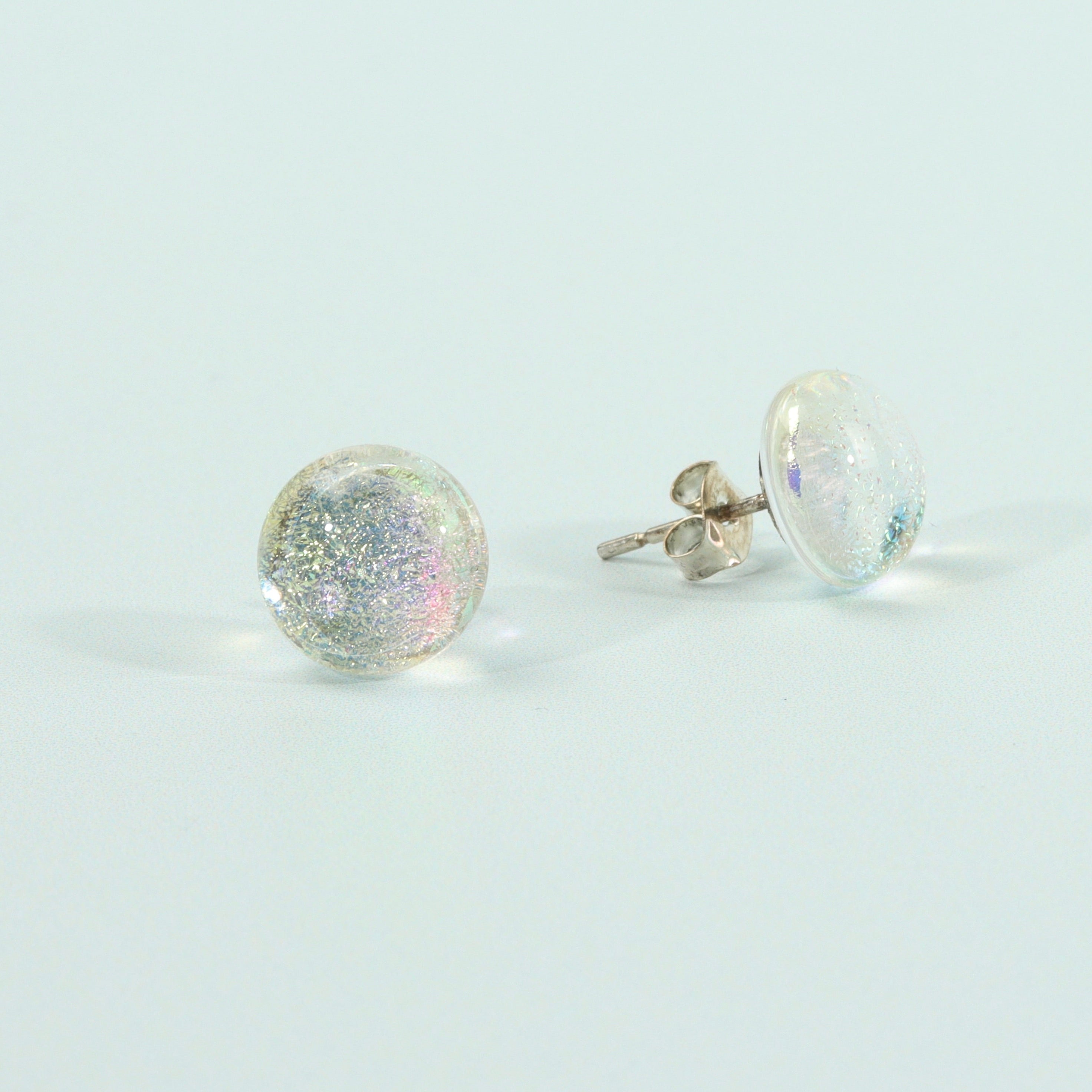 Beautiful Clear Dichroic Pearlescent stud earrings with sterling silver attachments. These handcrafted glass stones are created from molten glass before being set in the studs. There are several stages to the process of making these earrings and each pair are made to order. No shortcuts here.