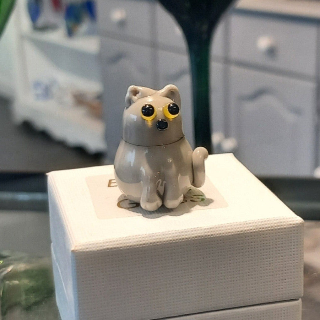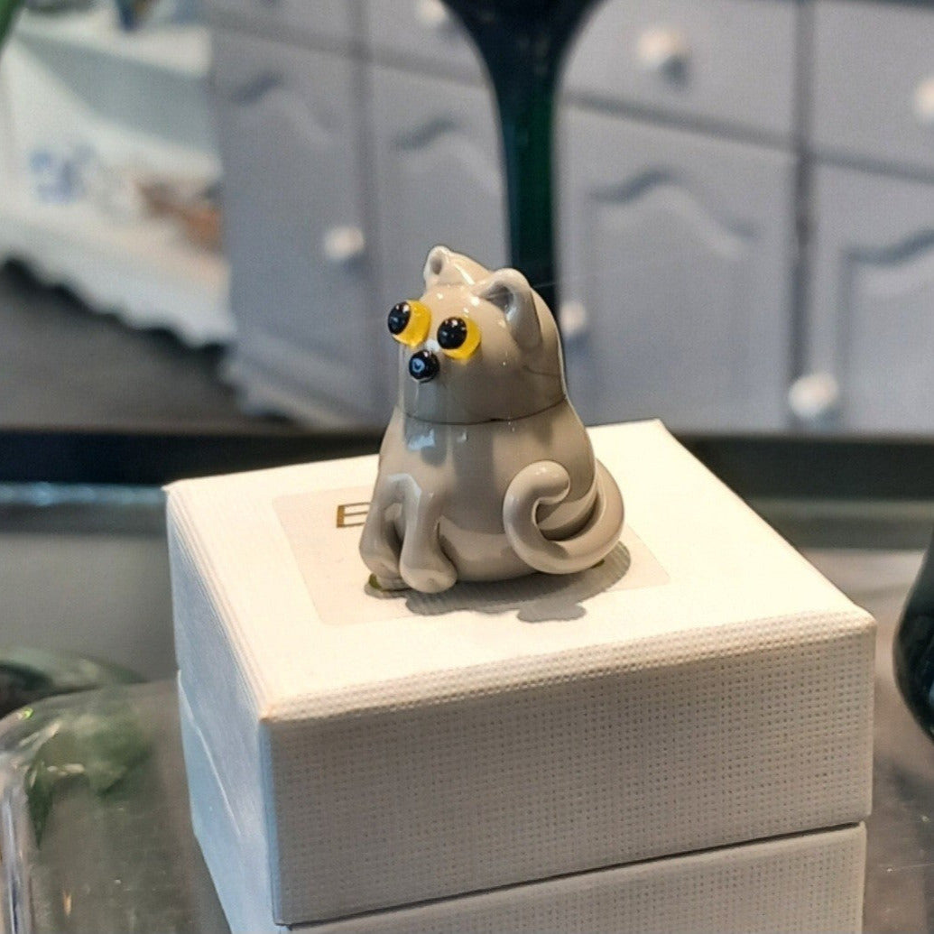 This dinky handmade glass cat gives joy to all, with its curly tail and ooglie eyes! The PURRfect dinky pressie for any cat lover! This teeny tiny wonder is lamp worked by hand and stands at 2cm high (ish).