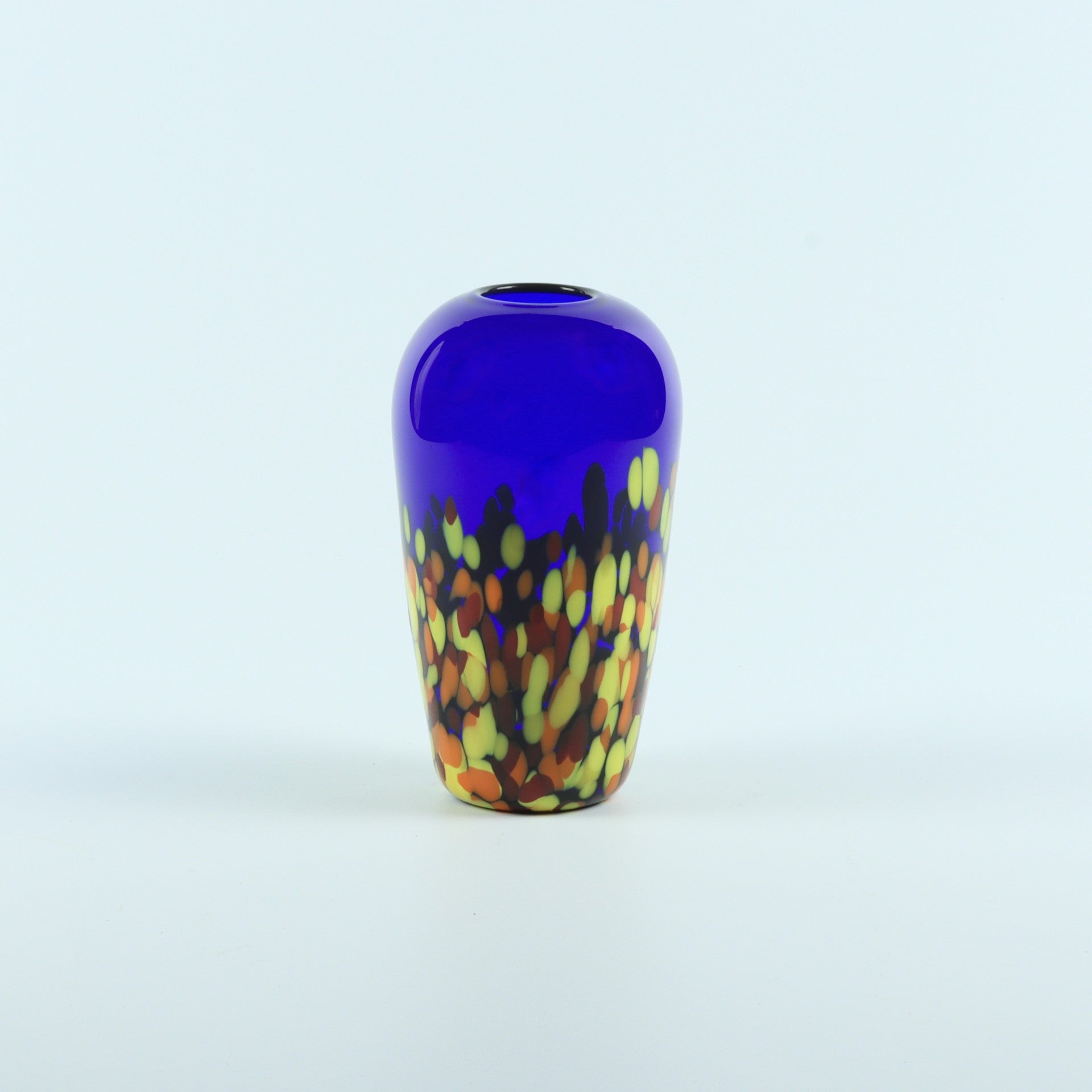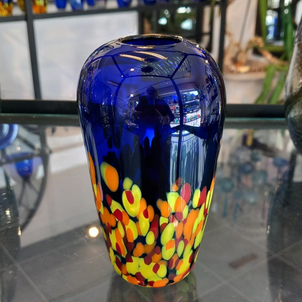 Each piece is a unique limited edition and is individually, hand-made and trailed with a colourful blaze of glass confetti in fiery Vivid Yellow and Burnt Orange.