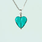 A fantastic teal green glass heart pendant necklace, made entirely by hand and threaded on a choice of either sterling silver marina or snake chains.