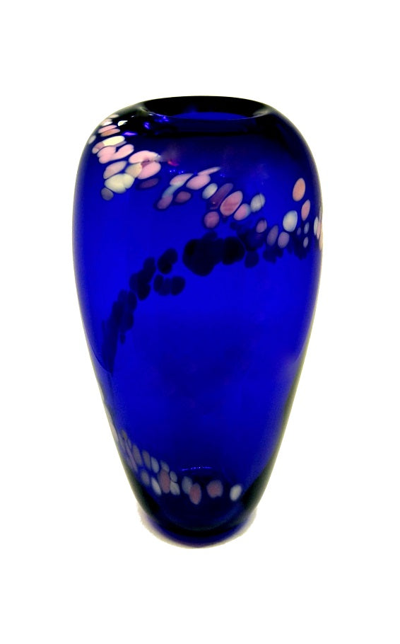 The Serenity range of Classic, one piece Bristol Blue Vases. Each piece is a unique, limited edition and is individually, hand made and trailed with a summer blossom trail of glass confetti in Rose Pink, Lilac and Opal.