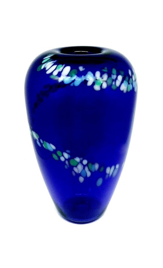 An opaque opal, cyan and green trail delicately decorates this sumptuous elliptical Bristol Blue vase. This hand made, limited edition item is approximately 23 cm tall