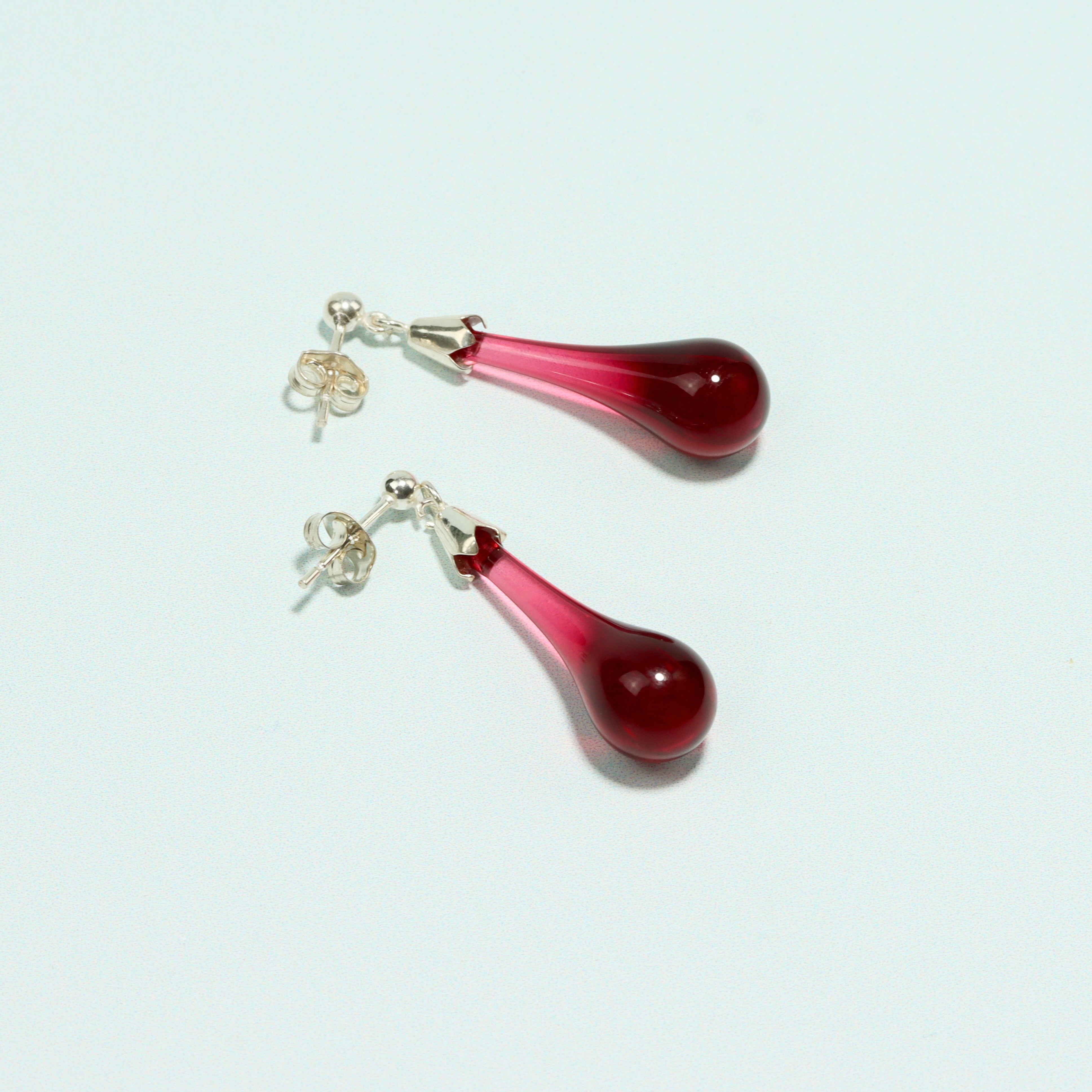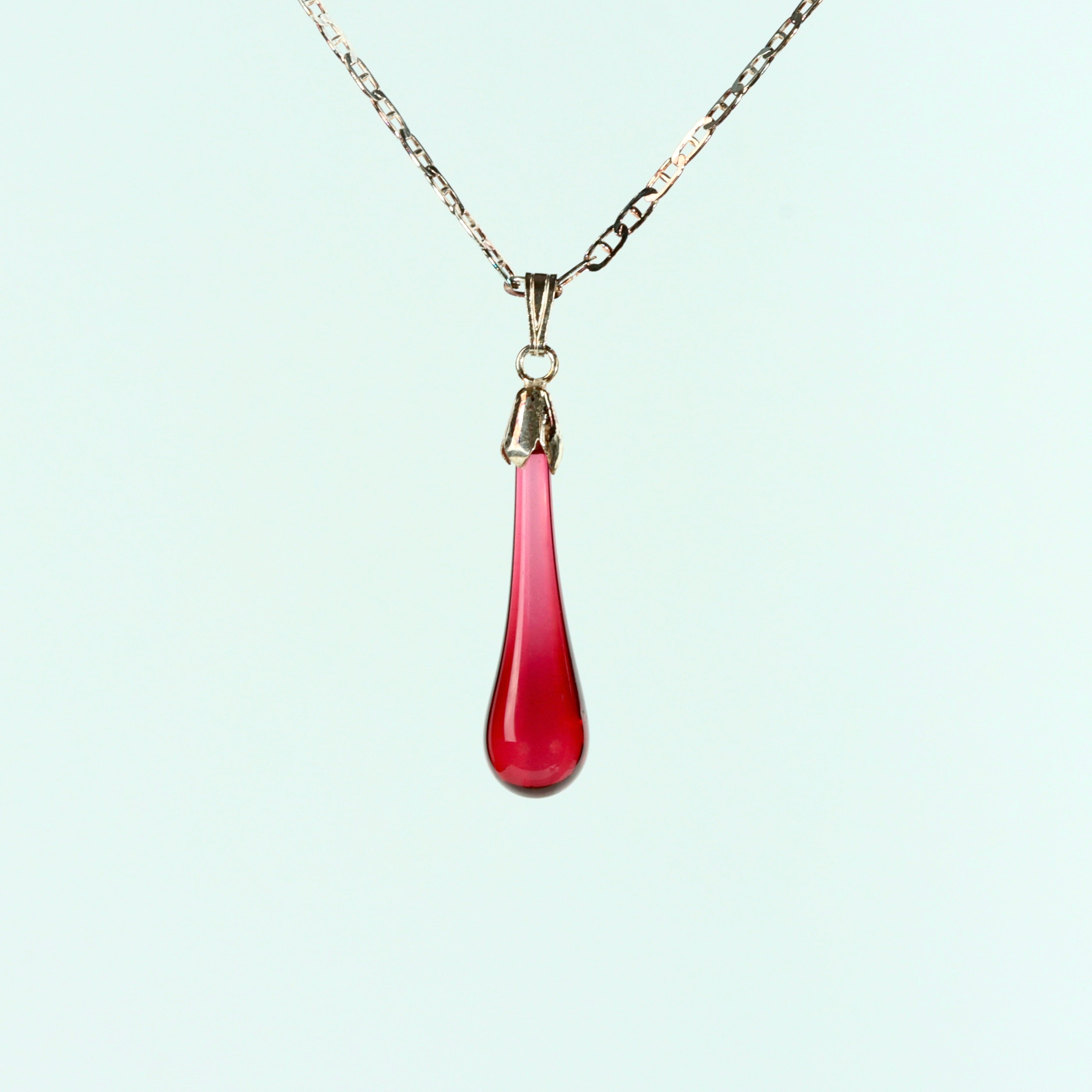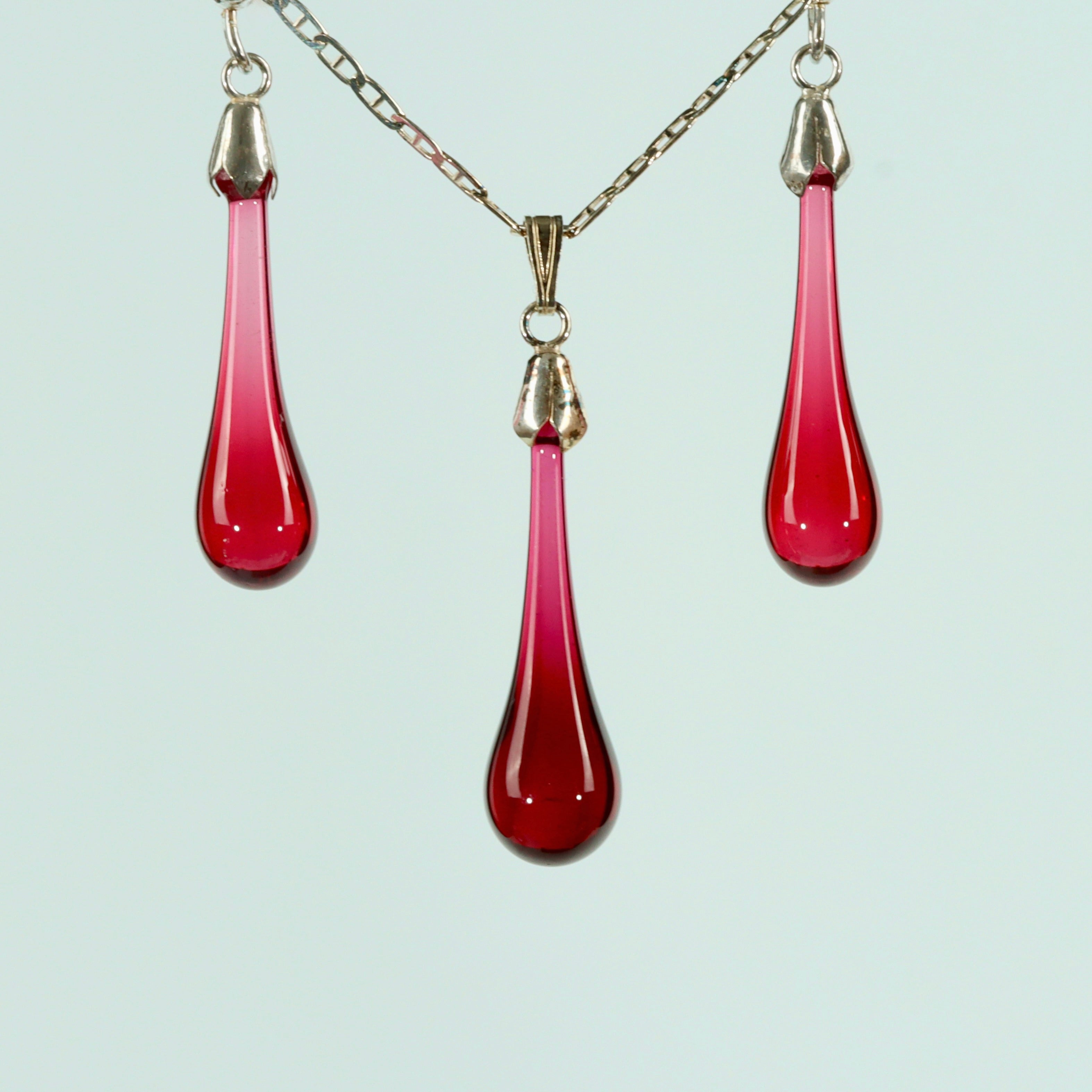 The popular ruby glass drop pendant necklace and stud earrings are sold as a set in a presentation box. Don't forget to choose the gift-wrap option if this is intended as a gift. All made by hand and we guarantee no machines or moulds are used in any part of the process. Choose from chain lengths 16" or 18" with two different chain styles.