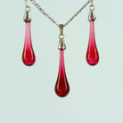The popular ruby glass drop pendant necklace and stud earrings are sold as a set in a presentation box.