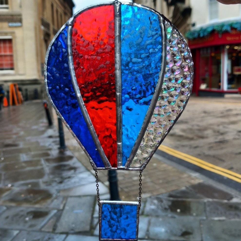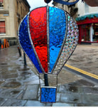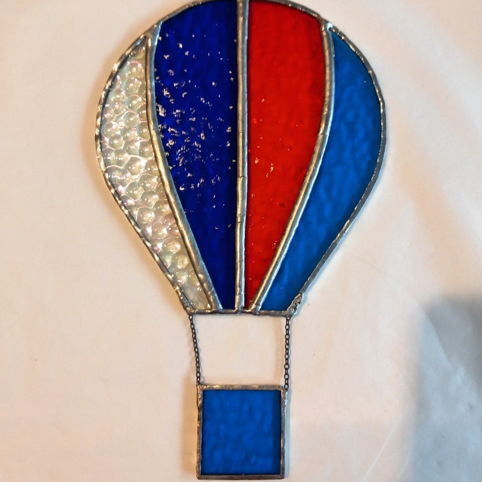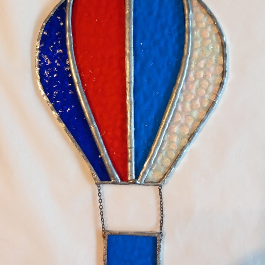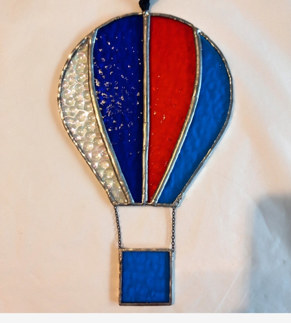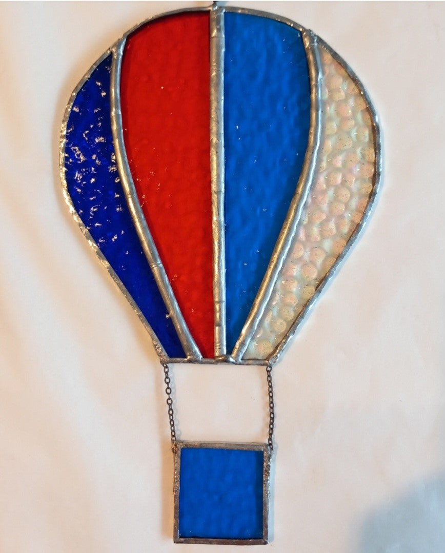 This Blue, Red and Clear Stained Glass Balloon has been copper foiled with lead/tin solder.