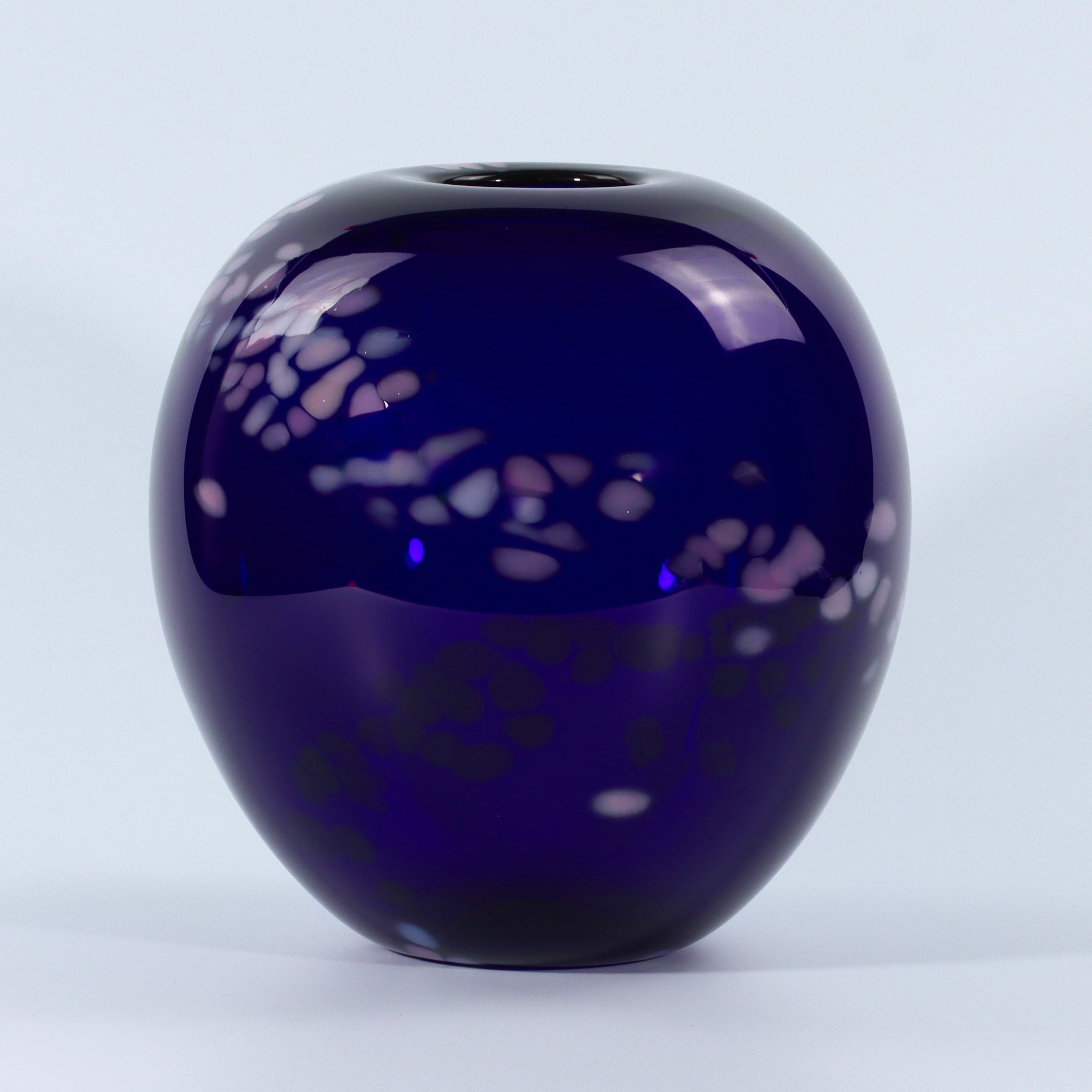 Each damson coloured vase is adorned with a gold lustre in a curved, or ribbon like, decoration running throughout the statement piece.