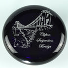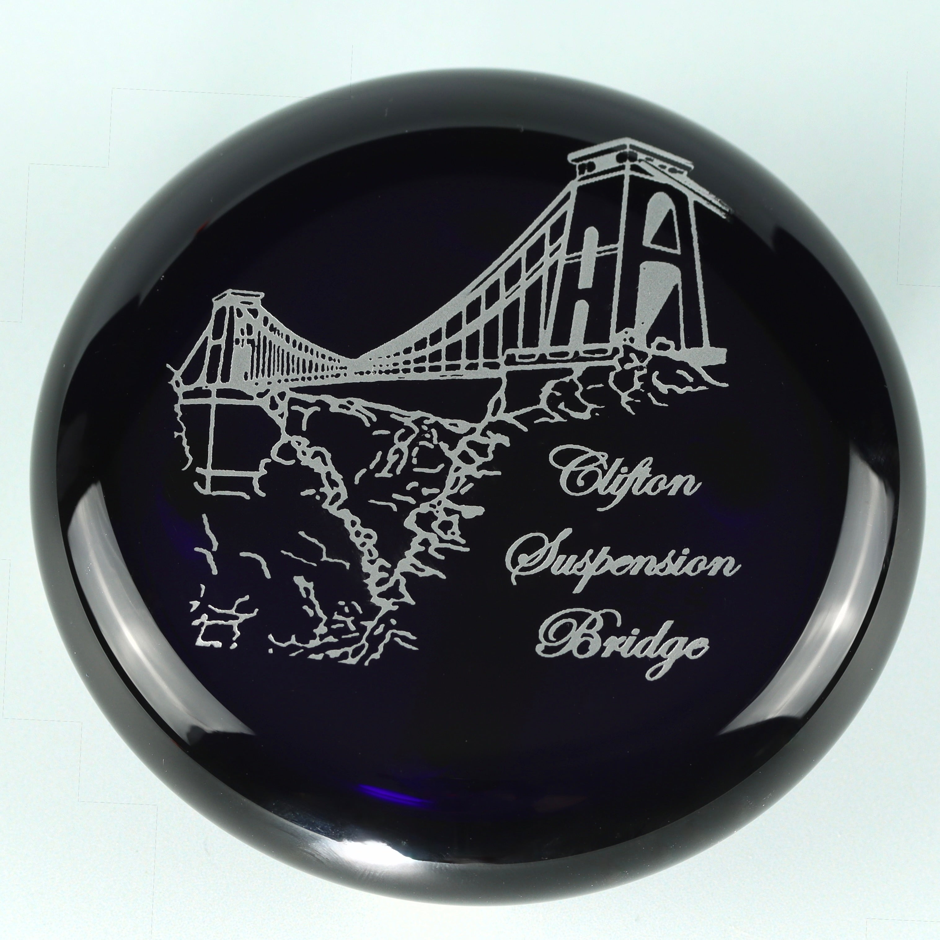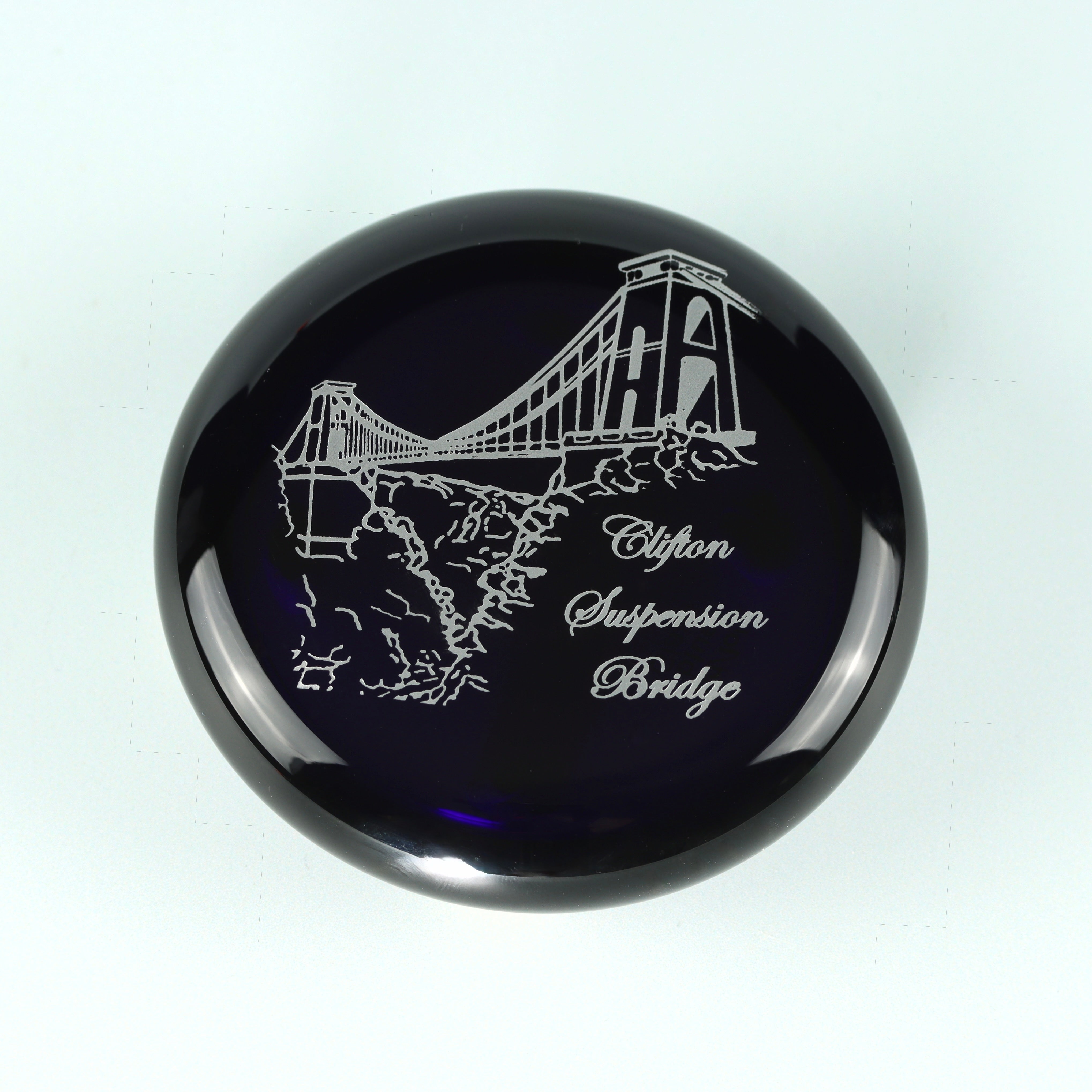A flat paperweight engraved with the image of the Clifton Suspension Bridge, designed by Isambard Kingdom Brunel and an iconic symbol of the City of Bristol.