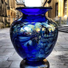 One of our special range, this large silver swirl blue glass round vase is designed to impress. Made from Bristol blue glass and with a lustrous pattern of silver applied to the outer surface of the vase. The silver is created by adding silver oxide to the molten glass. Each vase we make is most definitely unique. Handmade in Bristol, UK.