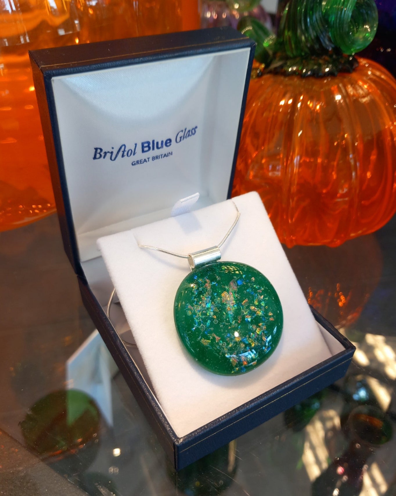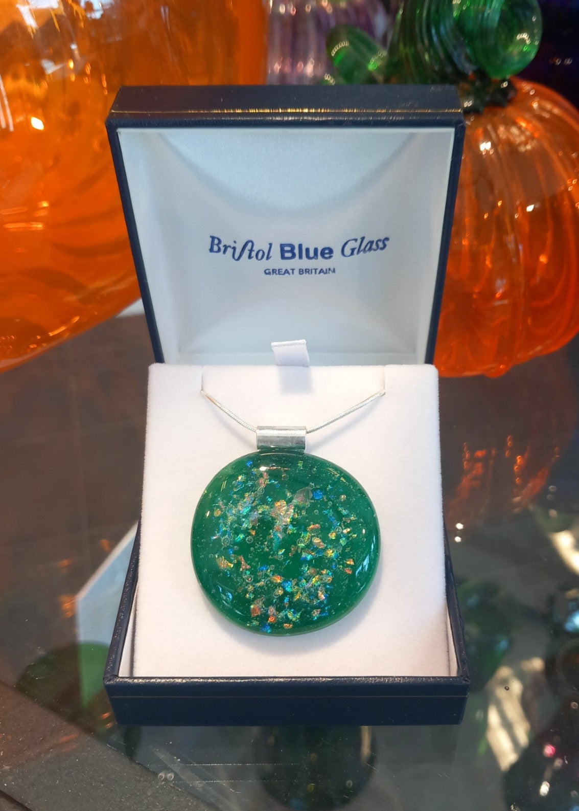 Dichroic glass pendant made in our workshop.
