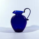 A mid-sized round blue glass jug that is ideally-suited for pouring cream or milk at the dinner table.