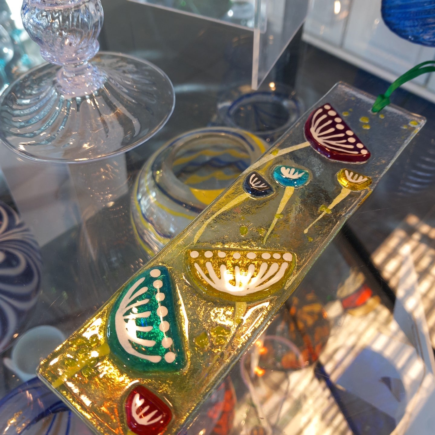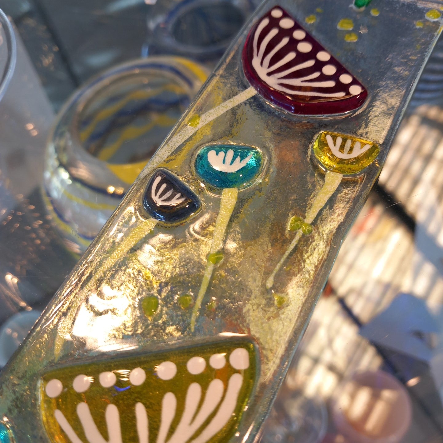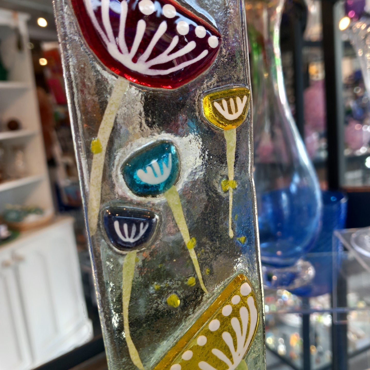 This fused glass flower scene suncatcher fills any room with joy and colour, and looks lovely hanging in a window with the sun shining through!