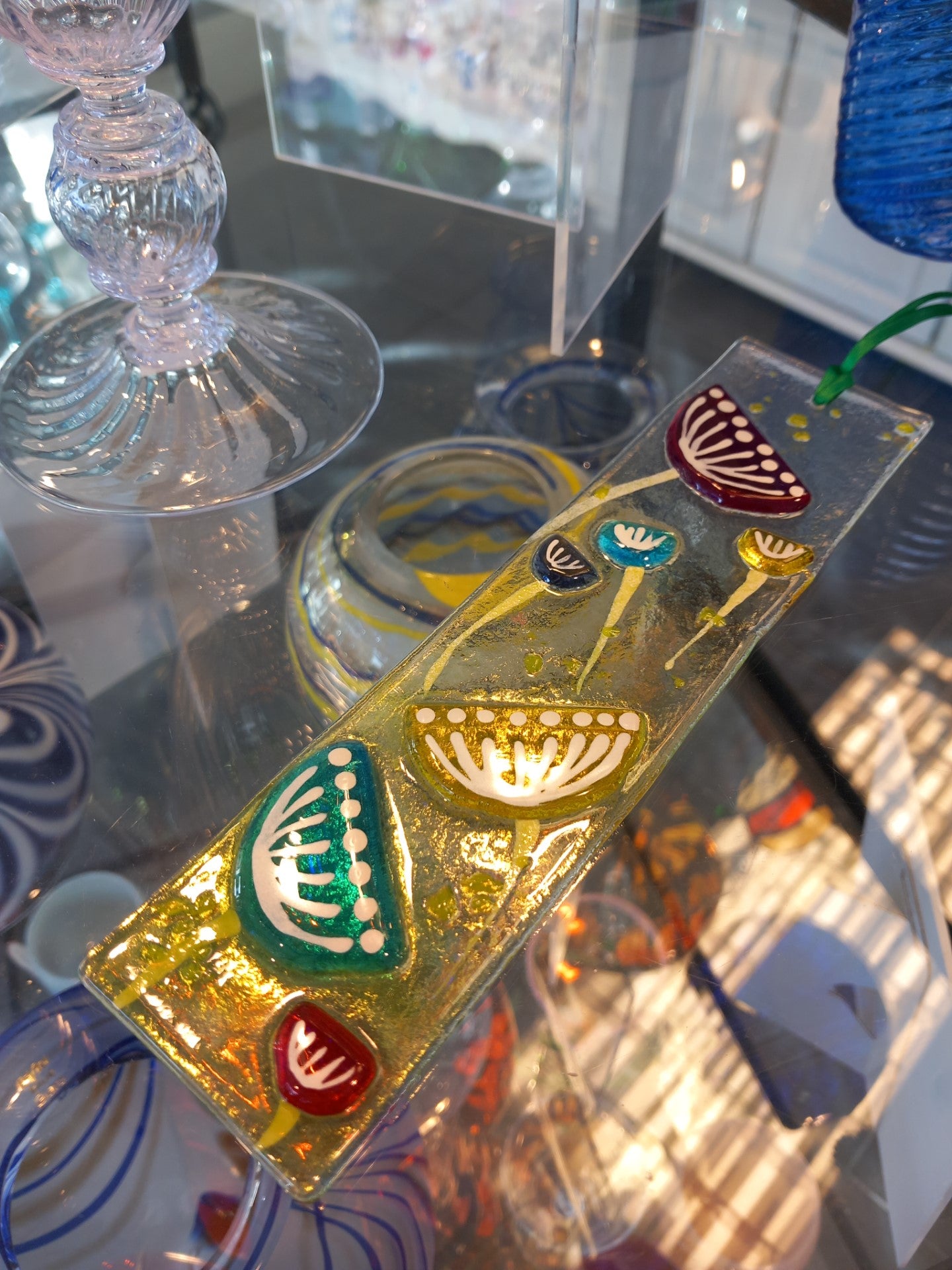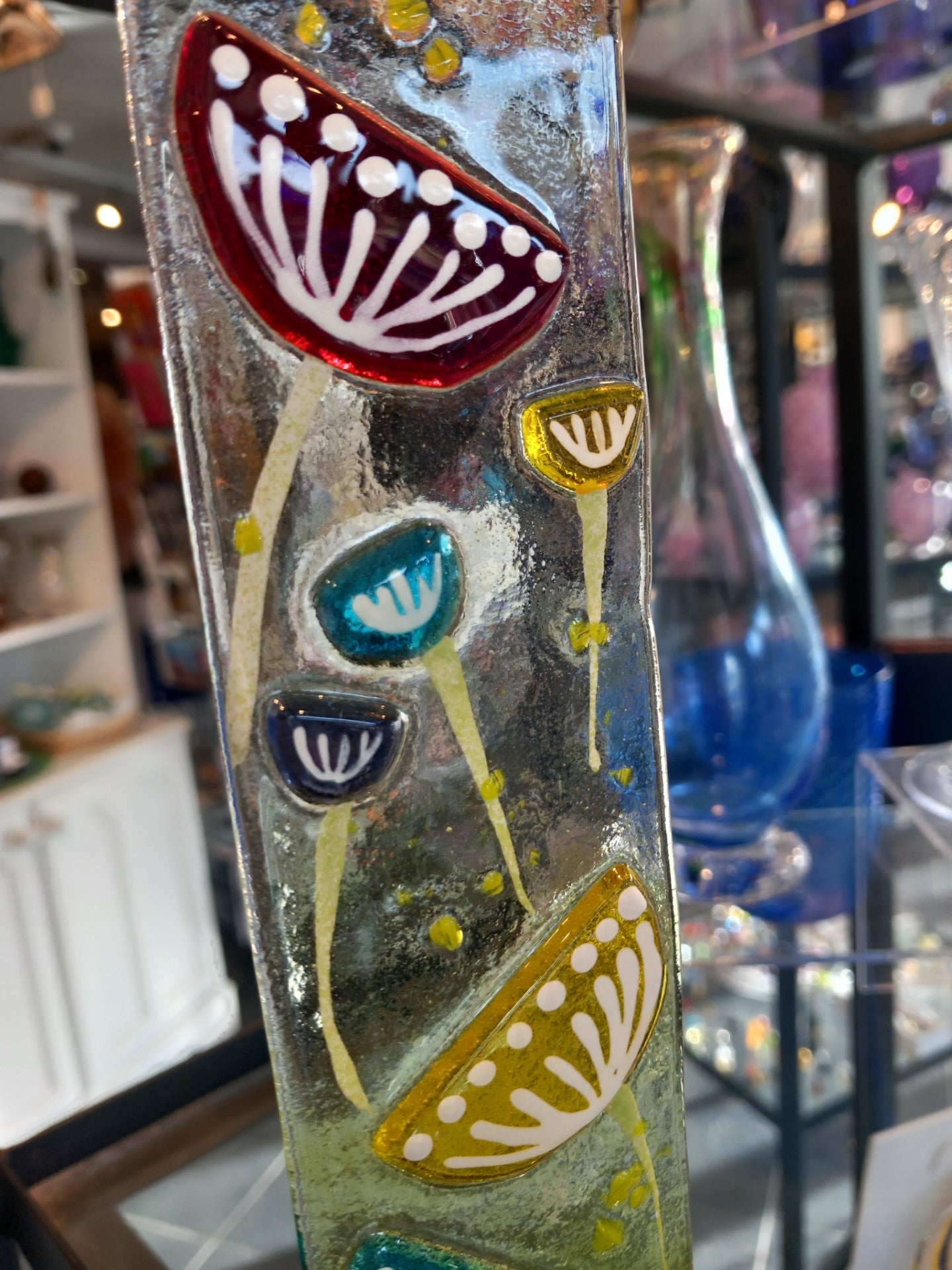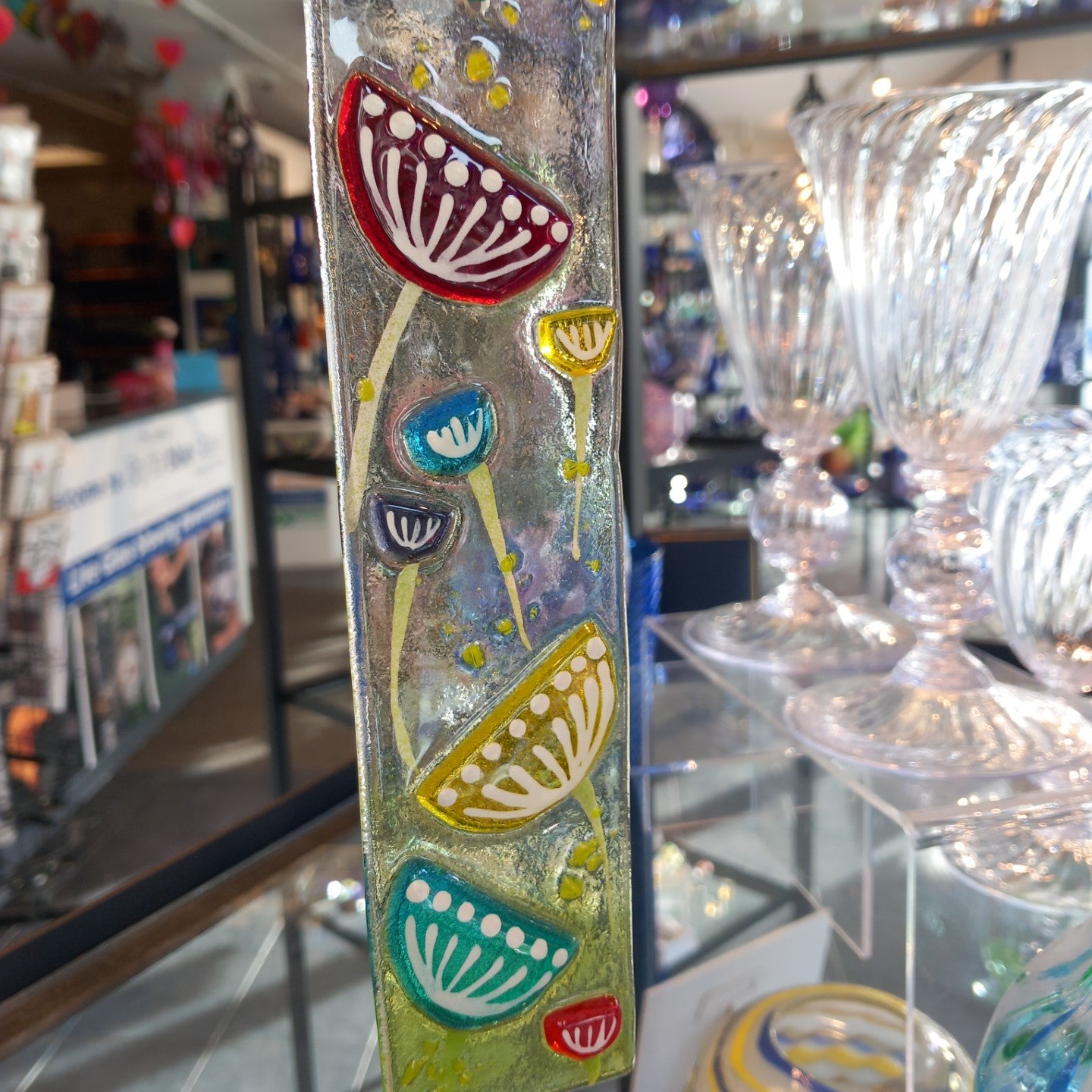 This fused glass flower scene suncatcher fills any room with joy and colour, and looks lovely hanging in a window with the sun shining through!