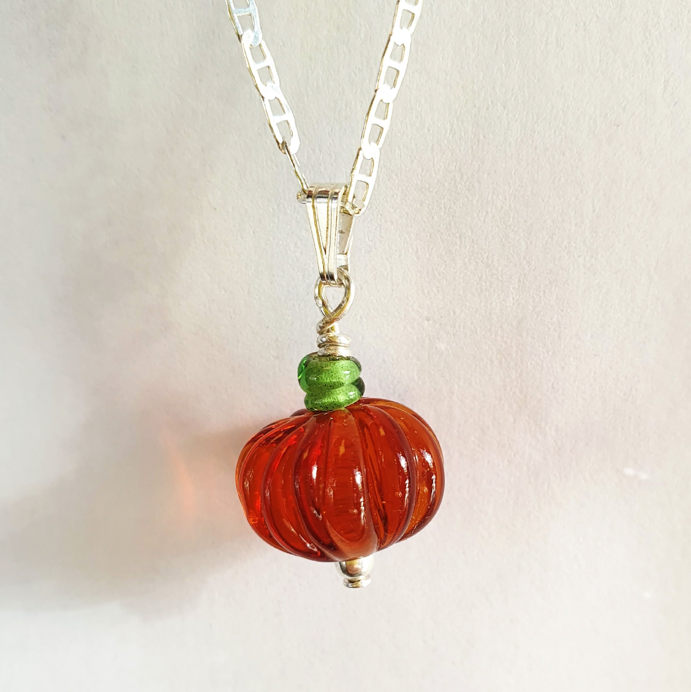 For a limited time only - a handmade amber glass Pumpkin Pendant on a 16" or 18" silver marina chain. The perfect pumpkin for your perfect pumpkin.