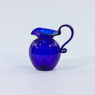A variation of the round blue glass jug of a similar size, this round optic blue jug is the same height (11.5cm / 4.5") but is slightly narrower and has a less fluted pouring spout. As with all the optic glassware this has a lined inscription around the outer surface and to finish a scrolled handle. Handmade to order.