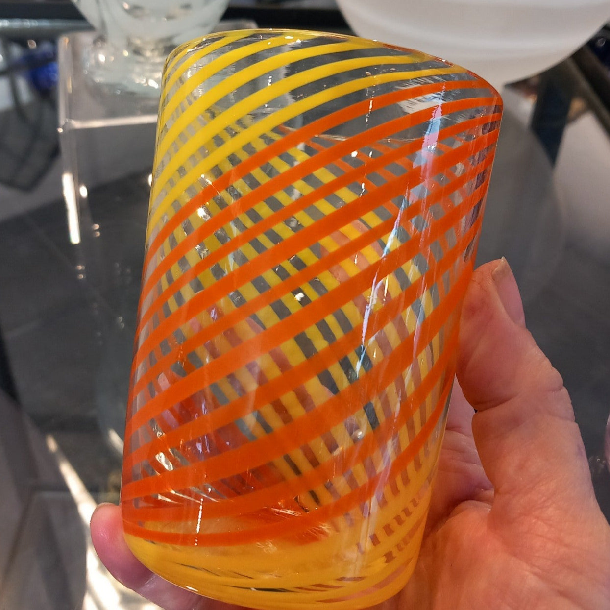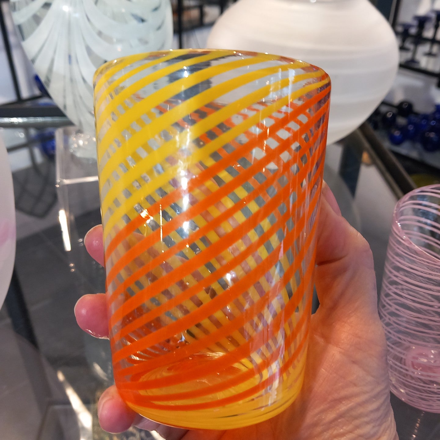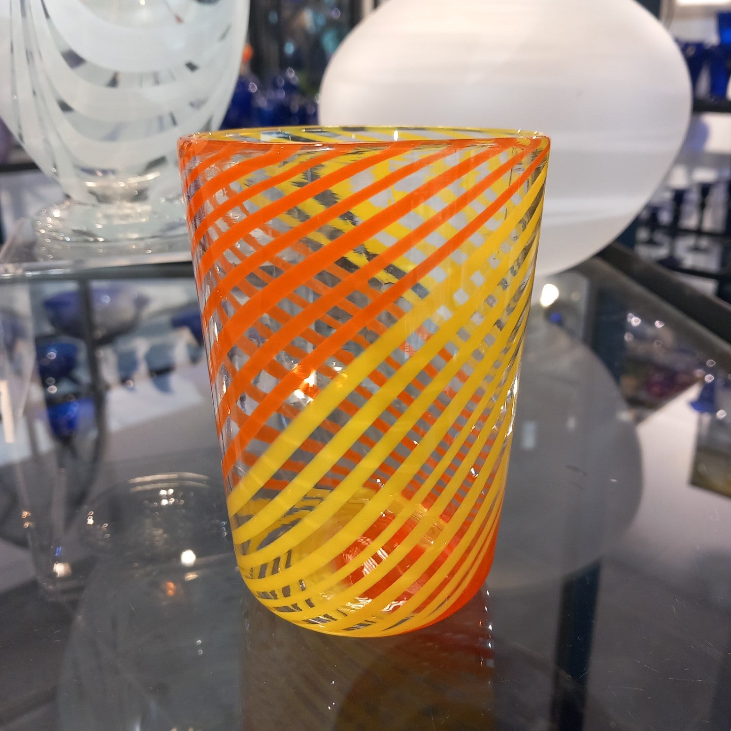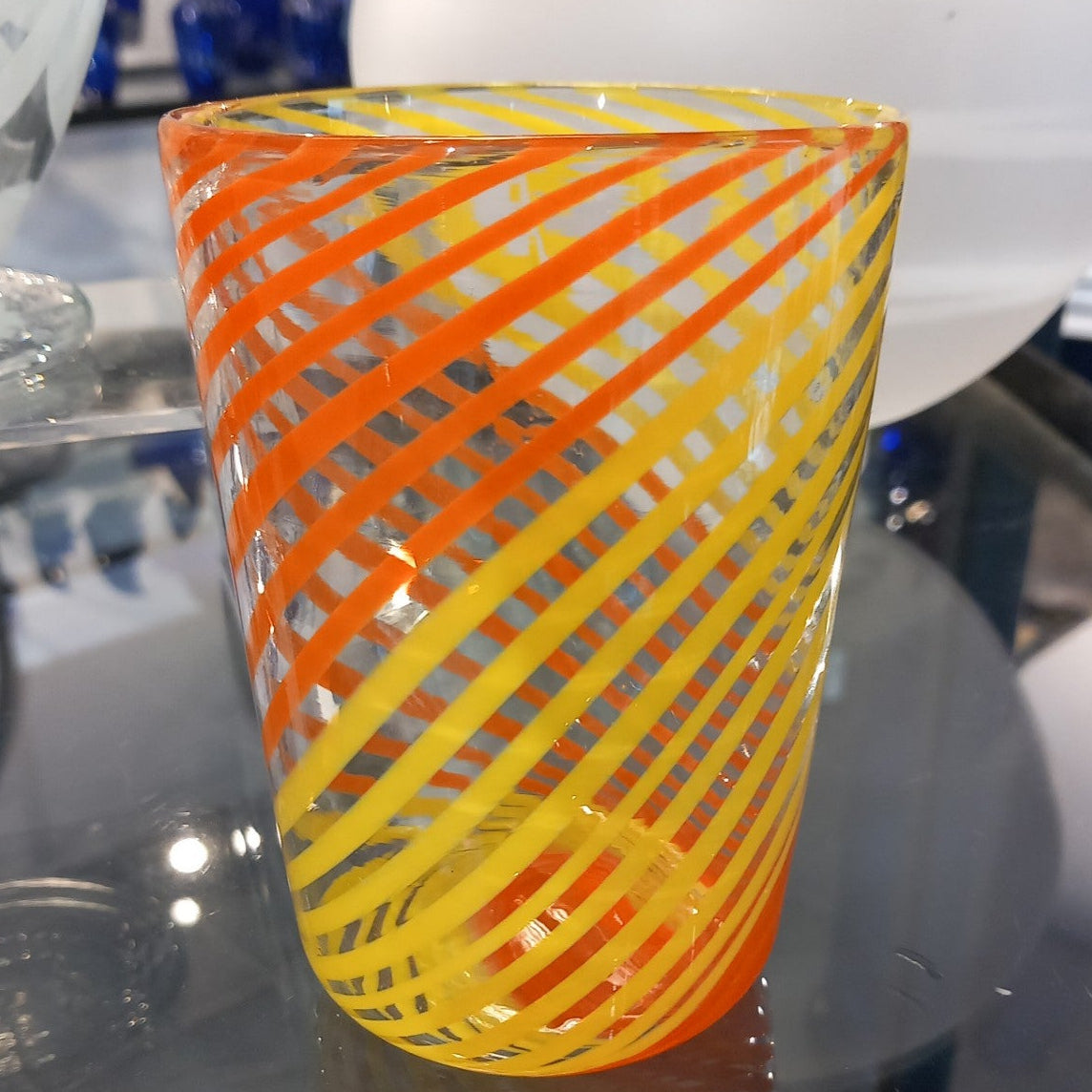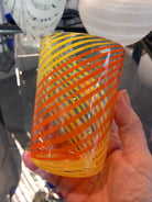 A one-off hand blown summer citrus twisted cane tumbler.
